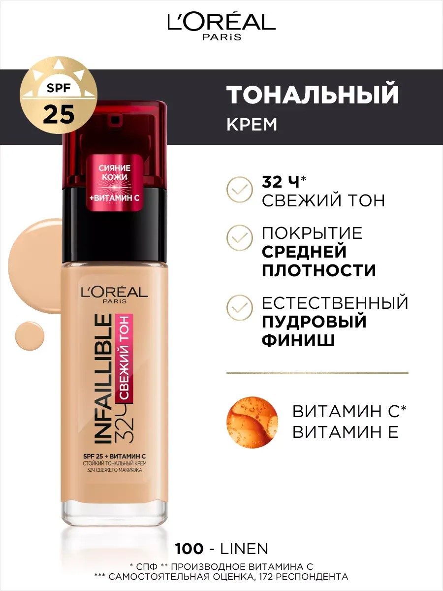 Французский увлажняющий тональный крем для лица INFAILLIBLE 32Ч СВЕЖИЙ ТОН от L'Oreal Paris — это идеальное решение для создания ровного и естественного макияжа. Этот стойкий тональный крем прекрасно подходит даже для летней жары, не скатывается и обеспечивает матирующий эффект, а также свежий тон до 32 часов.