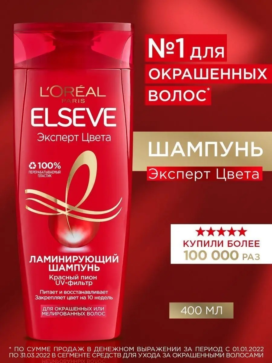 The effective shampoo "Elseve, Color Expert" is suitable for colored or highlighted hair. It contains a laminating elixir with red peony extract and a UV filter, providing significant results in three directions at once: 1- Maintains the brightness and saturation of color for a long time, preventing the washing out of coloring pigments and protecting hair color thanks to the UV filter; 2- Gives hair a luxurious shine; 3- Deeply nourishes hair and scalp, making hair smooth and silky to the very ends. Thanks to the professional lamination effect, your hair retains brightness and shine for up to 10 weeks! 1. Fixes and protects color for a long time 2. Gives dazzling shine 3. Nourishes and restores hair. Directions for use: Apply to damp hair, massage, then rinse. In case of contact with eyes, rinse immediately with water.