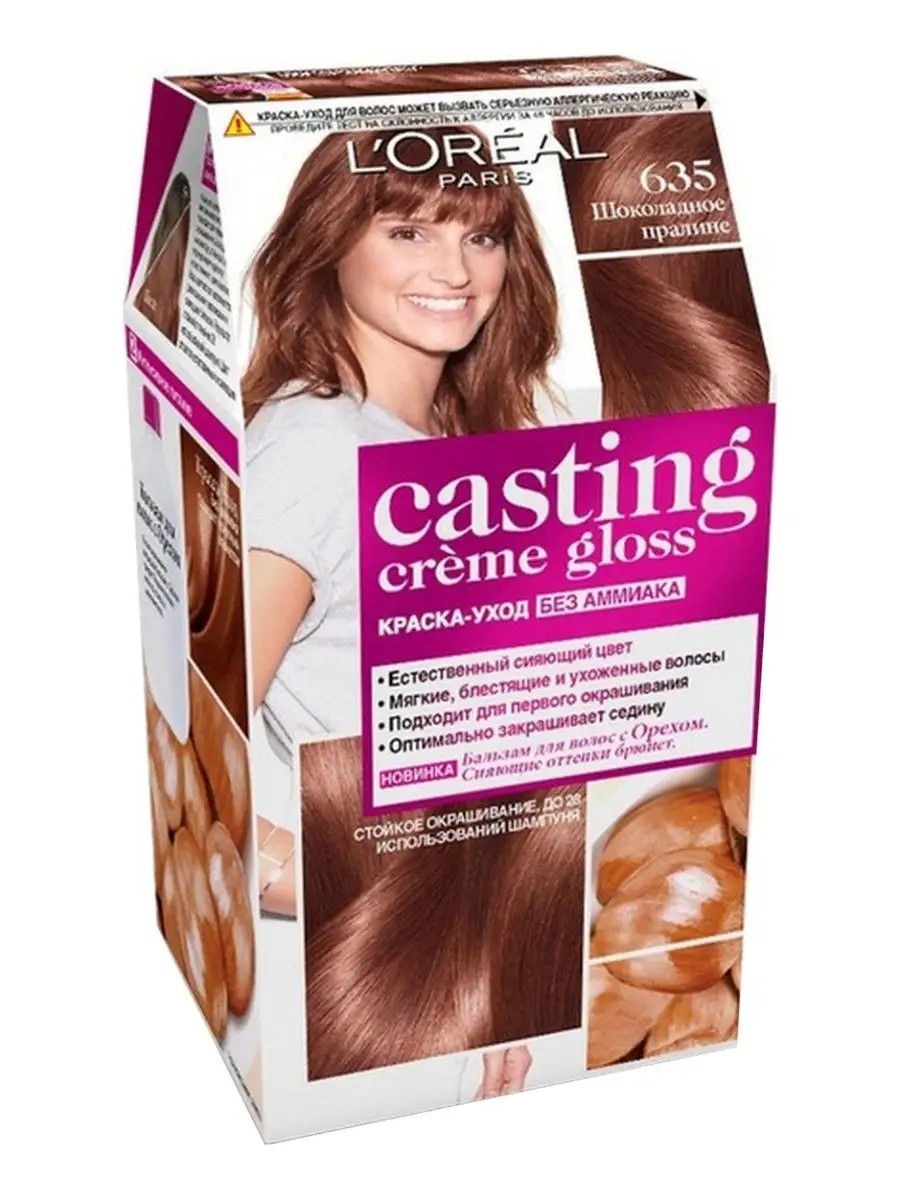 Hair coloring becomes a real care procedure, comparable to hair treatment in a beauty salon. The unique composition of the dye protects the hair structure from damage during coloring, while simultaneously caring for and smoothing the hair along the entire length. To maintain and enhance the effect of silky shiny hair after coloring, use the new "Maximum Shine" balm, enriched with royal jelly, which nourishes and smoothes the hair, giving it 4 times more shine week after week. The package contains: ammonia-free coloring cream (48 ml), a tube of developer milk (72 ml), a bottle of "Maximum Shine" hair balm (60 ml), a pair of gloves, instructions for use. How to use Hair dye "Casting Creme Gloss" is easy to use, thanks to the special bottle-applicator, the application of the dye is precise and simple. Full details of the coloring procedure are contained in the instructions.