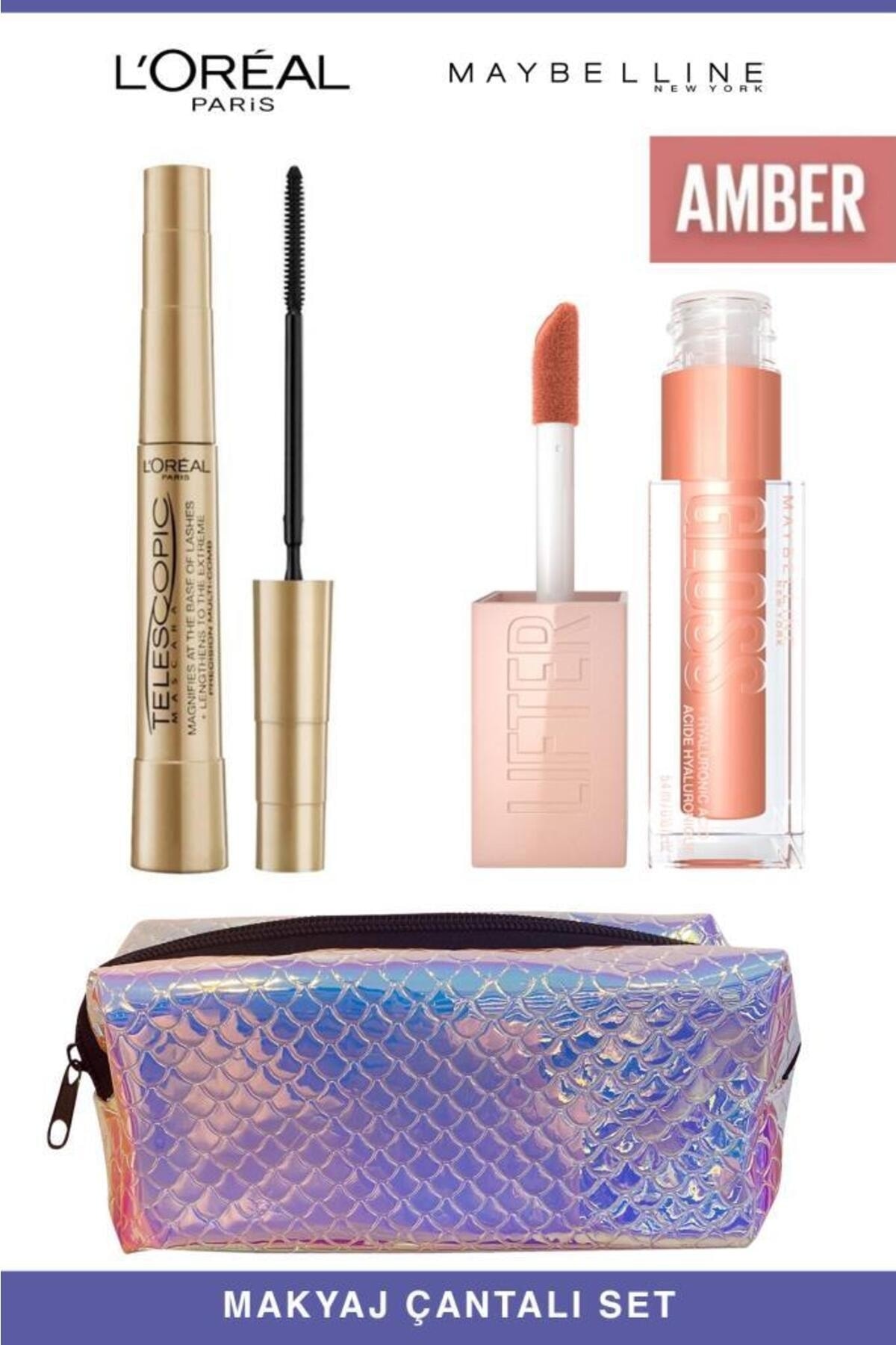 L'Oreal Paris Loreal Telescopic Instant Long Lashes-Maybelline Shiny and Full Lips 007 Amber Makeup Set