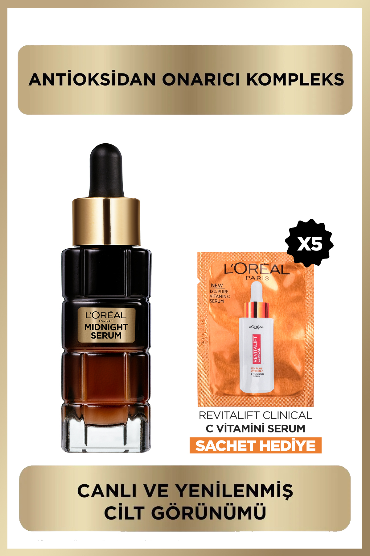 Yeni nesil cilt bakim serumu olan L'Oréal Paris Midnight Serum dermatologlarin onayladigi formülü ile milyonlarca cilt hücresinin yenilenmesini hizlandirir.Canli, parlak, aydinlik, daha genç ve siki cilt görünümü saglar.Antioksidan Onarici Kompleks içeren formülü cildin onarima en açik oldugu zaman olan geceleri, cildi serbest radikallere karsi korurERTESI SABAH: Cildi yogun sekilde nemlendirir ve güne dinlenmis görünen bir cilt ile uyanilmasini saglar.1 HAFTADA: Cilt daha genç, parlak ve isiltili bir görünüm kazanir.4 HAFTADA: Kirisiklik görünümü azalir ve cilt aydinlik bir görünüm kazanir. Cilt daha siki görünür.Midnight Serum Ana Hücre Bilimi'nden ilham aldi. Siz uyurken, diger tüm hücrelerin kaynaginda bulunan ve en degerli hücreler olarak tanimlanan ana hücreler daha etkin hale gelirler. Optimum etkinlikleri gece yarisindan baslayarak geceleri zirveye ulasir. Midnight Serum, daha genç görünen bir cilt için hücre yenilenmesini hizlandirmak üzere formüle edilmistir.Tüm cit tipleri için uygundurYapiskan his birakmazHizli emilen rahatlatici dokuKULLANIM TAVSIYESITemizlenip kurulanmis yüz ve boyun bölgenize gündüz ve geceleri nemlendiriciden önce 3-4 damla uygulayin.