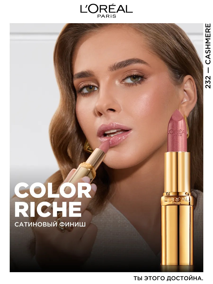 Культовая помада L'Oreal Paris с 1985 года. Колор Риш - сочетание насыщенных пигментов цвета и драгоценных масел в одном флаконе. Сатиновый финиш, скользящее нанесение, богатая палитра оттенков. 75% ухаживающих компонентов в составе. Экстракты камелии и лотоса, масла арганы и жожоба глубоко питают и увлажняют нежную кожу губ. Больше чем цвет. Роскошь цвета и ухода за вашими губами. Помада равномерно распределяется по губам за счет легкой текстуры. Для более интенсивного цвета и продления стойкости используйте в паре с карандашом Колор Риш от Лореаль Париж. Избегайте попадания в глаза. В случае попадания в глаза тщательно промыть их водой.