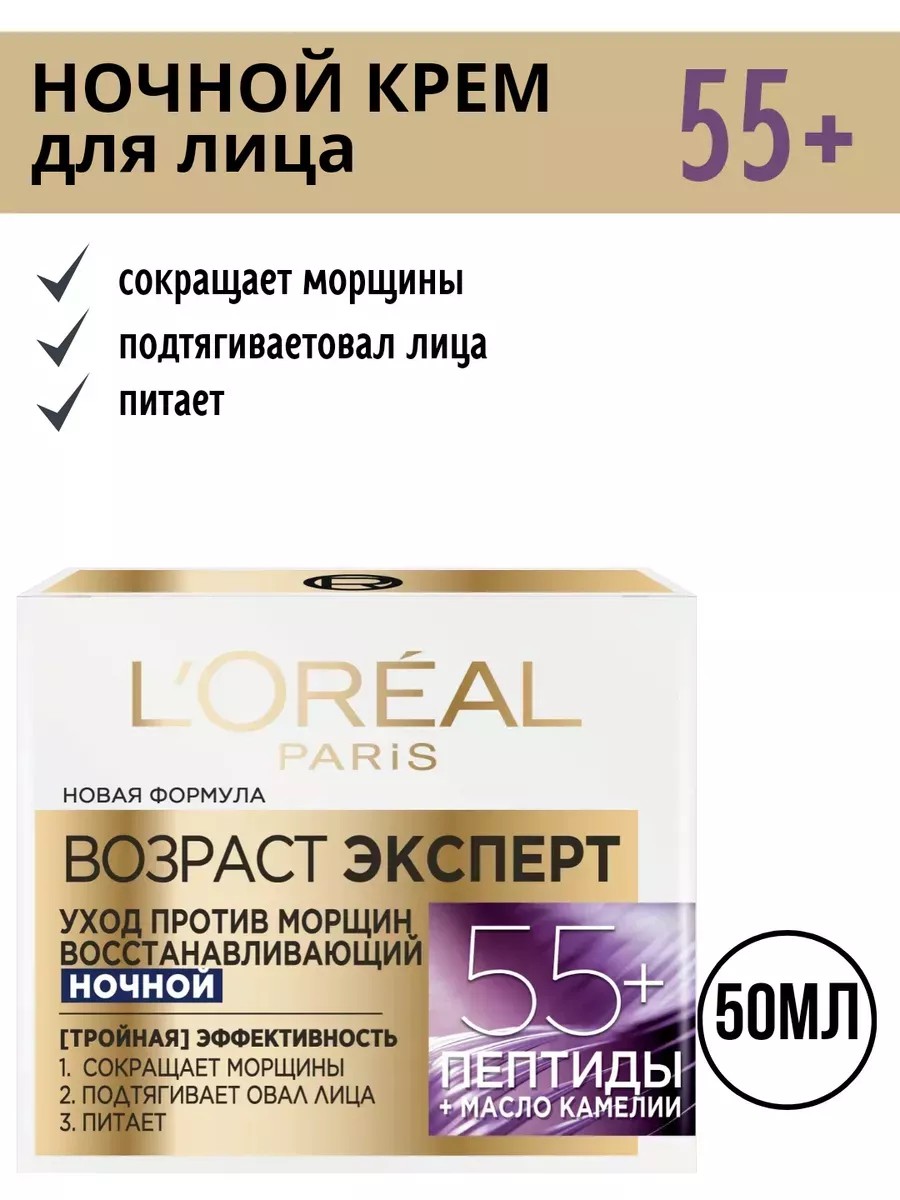 Восстанавливающий уход против морщин "Возраст Эксперт 55+" от L'Oreal Paris (Лореаль Париж) создан специально для ухода за кожей после 55 лет и визуально устраняет возрастные признаки. Пептиды стимулируют выработку эластина, способствуя восстановлению упругости и укреплению кожи. Масло камелии способствует интенсивному питанию и мягкости кожи.