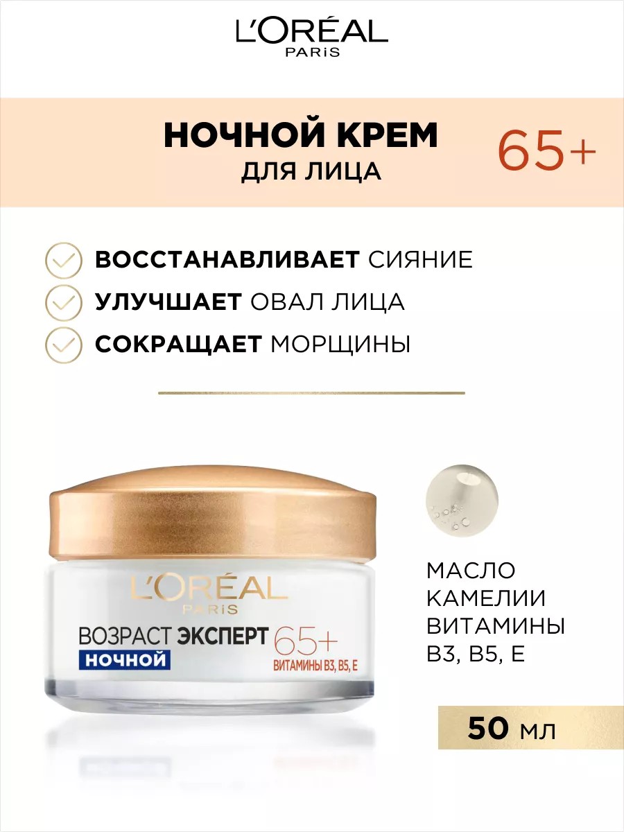 Nourishing anti-wrinkle care "Age Expert 65+" from L'Oreal Paris is specially designed for skin care after 65 years and visually eliminates the signs of aging. A highly effective combination of vitamins B3, B5, and E promotes natural skin renewal processes and strengthens its protective barrier. Camellia oil promotes intensive nourishment and softness of the skin.