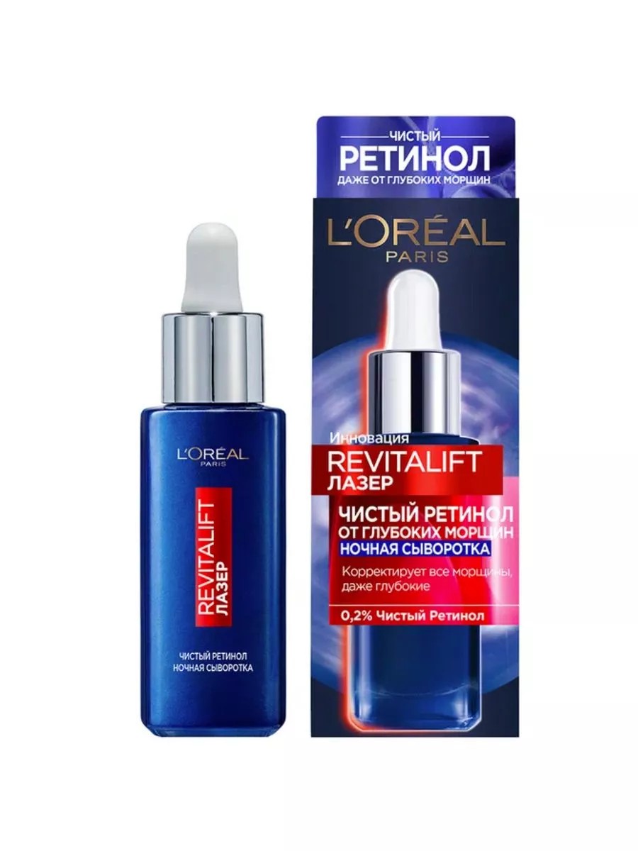 L'Oreal Revitalift, Ночная сыворотка для лица 0,2 % чистый ретинол против морщин 30 мл, Германия. Мощный уход для коррекции видимых возрастных изменений, включая даже глубокие морщины. Морщины сокращены у 100% женщин. 0,2 содержания ретинола - №1 ингредиент для борьбы с морщинами, используемый дерматологами. Мгновенный результат – кожа более увлажненная и выглядит заметно разглаженной. Через 1 месяц – текстура кожи выглядит заметно моложе и сияющей. Через 4 месяца – морщины сокращены на 36%. Заметное сокращение глубоких морщин. Чистый ретинол – наиболее сильнодействующая форма ретинола, которую дерматологи рекомендуют для обновления кожи. Этот антиоксидант борется с видимыми признаками старения, такими как глубокие морщины и неровная текстура кожи. Инновационная стабилизированная формула сыворотки, поданная на патент, разработана так, чтобы сохранить свою эффективность и не позволить ретинолу распадаться (что присуще данному витамину под влиянием света и кислорода).