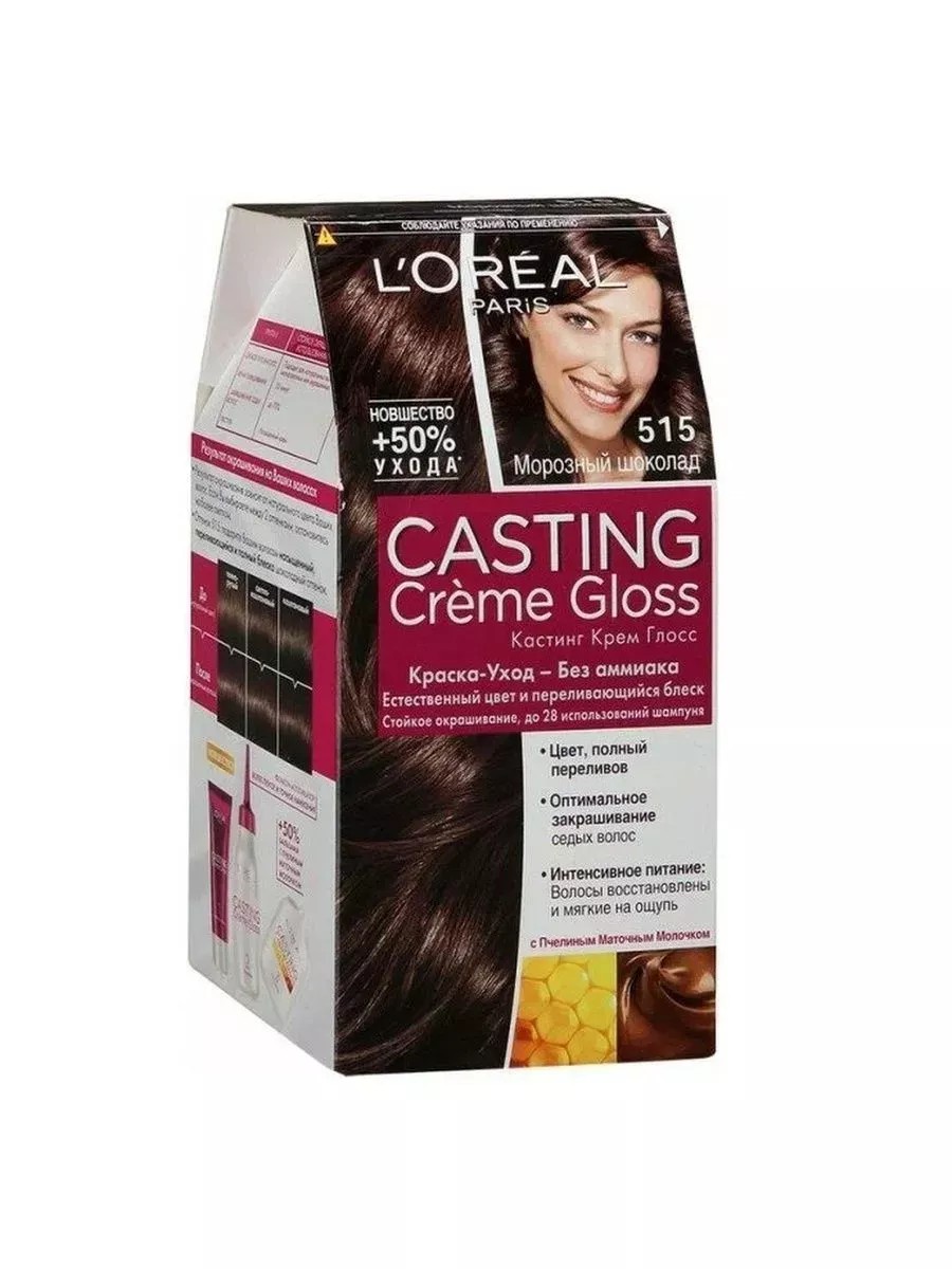 L'Oreal Paris, Стойкая краска-уход для волос, 515 Морозный шоколад. Окрашивание волос превращается в настоящую процедуру ухода, сравнимую с оздоровлением волос в салоне красоты. Уникальный состав краски во время окрашивания защищает структуру волос от повреждения, одновременно ухаживая и разглаживая их по всей длине. Сохранить и усилить эффект шелковых блестящих волос после окрашивания позволит использование нового бальзама для волос с Медом, который придает Вашим волосам мягкость, блеск и шелковистость.В состав упаковки входит: красящий крем без аммиака (48 мл), тюбик с проявляющим молочком (72 мл), флакон с бальзамом для волос с Медом (60 мл), пара перчаток, инструкция по применению.