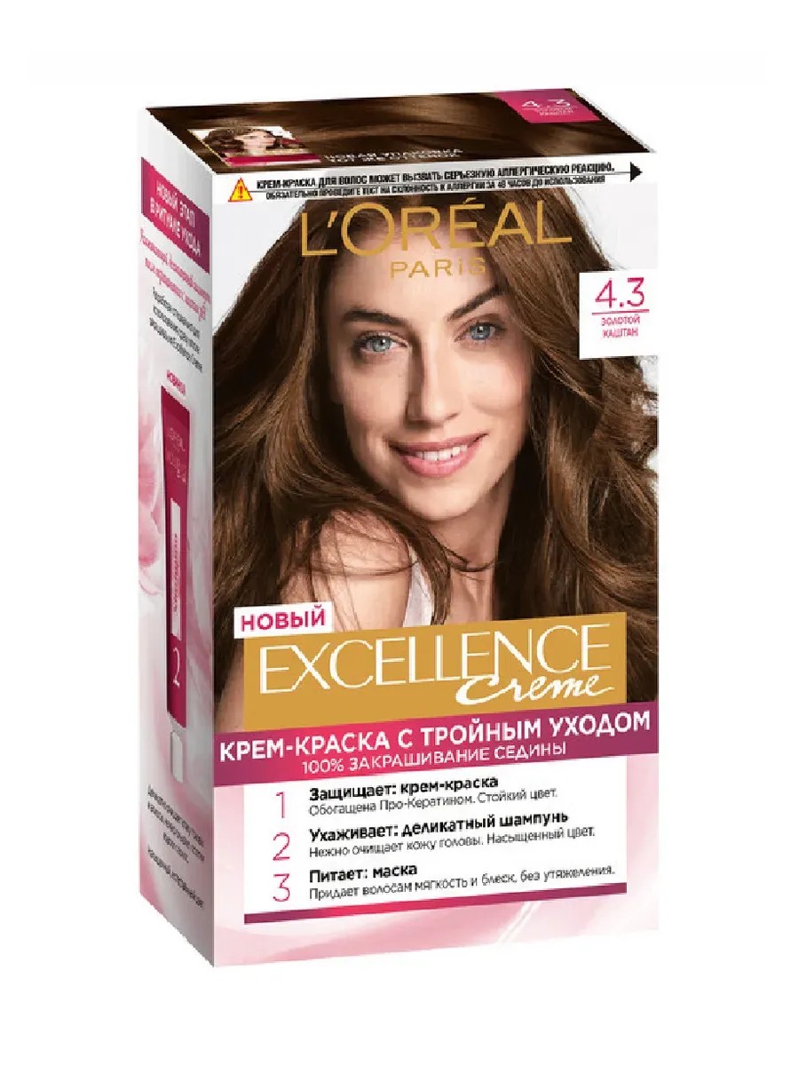 L'Oreal Paris, Стойкая крем-краска Excellence, тон 4.3 Золотой Каштан, 270 мл. Ритуал тройного ухода: уход за цветом, уход за кожей головы, уход за волосами. Крем-краска с тройным уходом. 100% закрашивание седины. 1. Защищающая крем-краска для волос. Обогащена Про-Кератином и защищающей сывороткой для защиты волос во время окрашивания. Стойкий цвет. 2. Новый этап в ритуале ухода: ухаживающий деликатный шампунь после окрашивания с мягким pH. Деликатно очищает кожу головы и волосы после окрашивания. Насыщенный, естественный цвет. 3. Легкая питательная маска для волос. Обогащена Керамидом. Питает волосы, делает их мягкими и блестящими, без утяжеления.