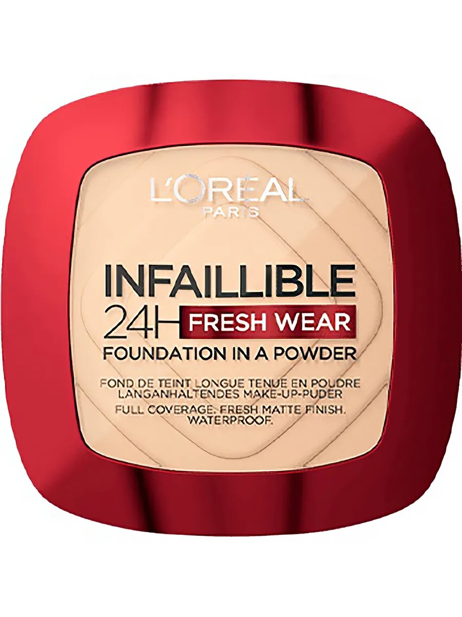 L'Oreal Paris Infaillible 24H Fresh Wear Face Powder, Shade 120, 9 g. Next-generation INFAILLIBLE 24H FRESH WEAR powder. A fluid foundation in a compact powder format. The powder combines the best of both worlds: the coverage and longevity of foundation and the natural matte finish of powder. It conceals pores and visibly evens skin tone in one stroke. Try this powder! Visibly evens skin tone and texture, provides a long-lasting matte finish for 24 hours, is resistant to moisture and high temperatures, tested under a mask, and is non-comedogenic. Directions: Moisturize your skin before applying. It is recommended to apply the powder with the included sponge. A dry sponge will give a more natural result, while a damp sponge will create denser coverage. Can be used as a stand-alone foundation or to touch up your makeup throughout the day. We recommend combining it with the long-lasting multi-functional concealer INFAILLIBLE for more pronounced correction of imperfections. Composition: TALC, ZINC STEARATE, DIMETHICONE, ZEA MAYS STARCH/CORN STARCH, CAPRYLIC/CAPRIC TRIGLYCERIDE, SILICA, DIMETHICONE/VINYL DIMETHICONE CROSSPOLYMER, TRIETHOXYCAPRYLYLSILANE, CAPRYLYL GLYCOL, ETHYLHEXYLGLYCERIN, POTASSIUM SORBATE, PARFUM/FRAGRANCE, ISOCETETH-10, ALARIA ESCULENTA EXTRACT, HEXYL CINNAMAL, BENZYL SALICYLATE, LINALOOL, ALPHA-ISOMETHYL IONONE, BENZYL ALCOHOL, CITRONELLOL, TOCOPHEROL, [+/- MAY CONTAIN CI 77891/TITANIUM DIOXIDE, CI 77491, CI 77492, CI 77499/IRON OXIDES, MICA, CI 19140/YELLOW 5 LAKE, CI 77007/ULTRAMARINES, CI 15850/RED 7 LAKE,