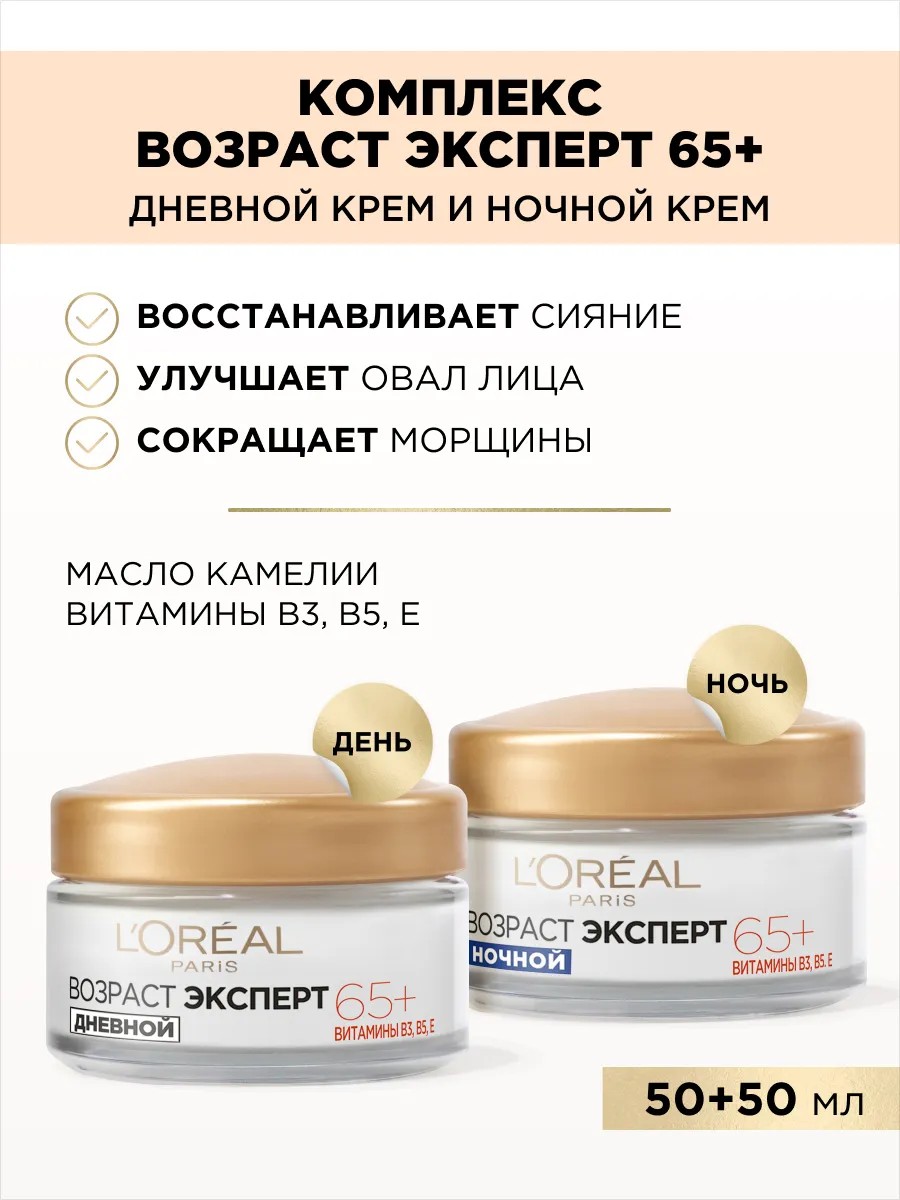Nourishing anti-wrinkle care "Age Expert 65+" from L'Oreal Paris is specially designed for skin care after 65 and visually eliminates the signs of aging. A highly effective combination of vitamins B3, B5, and E promotes natural skin renewal processes and strengthens its protective barrier. Camellia oil promotes intense nourishment and softness of the skin.