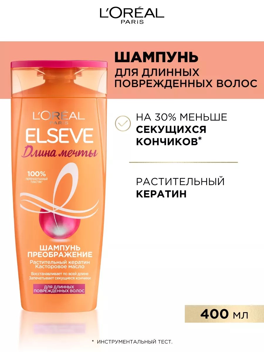 Шампунь Преображение ELSEVE, ДЛИНА МЕЧТЫ для длинных поврежденных волос, с кератином. Уникальная формула шампуня Elseve, Длина Мечты от L'Oreal Paris обогащена питательным коктейлем, который запечатывает секущиеся кончики и восстанавливает по всей длине: растительный кератин восстанавливает ваши волосы до самых кончиков; витамин В5 укрепляет волосы; касторовое масло глубоко питает и дарит блеск.