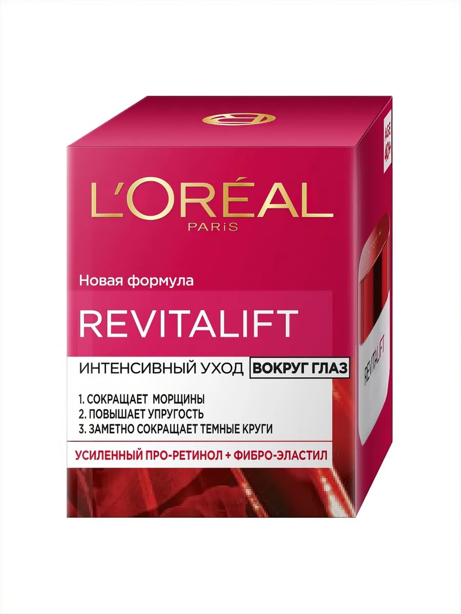 L'Oréal Paris Revitalift Anti-Wrinkle Eye Cream, Intensive Care, 15 ml. Revitalift anti-aging face cream is a legendary treatment from L'Oréal Paris. It has a triple remodeling effect: visibly reduces wrinkles, improves skin elasticity, and combats dark circles and bags under the eyes. The unique Stimulift technology included in the Revitalift formula is aimed at stimulating eight natural lifters in the skin's layers. It also contains Pro-Retinol A, which smooths wrinkles. As a result, the skin appears more elastic and hydrated, wrinkles are reduced, and dark circles under the eyes disappear. Directions: Apply morning and evening with light patting movements to the eye area, from the inner corner to the outer. Ingredients: AQUA/WATER/EAU, DIMETHICONE, GLYCERIN, C12-15 ALKYL BENZOATE, SHOREA ROBUSTA SEED BUTTER, STEARIC ACID, PALMITIC ACID, ZEA MAYS STARCH/CORN STARCH, CERA ALBA/BEESWAX/CIRE DABEILLE, GLYCERYL STEARATE, PEG-100 STEARATE, GLYCINE SOJA PROTEIN/SOYBEAN PROTEIN, HYDROLYZED SOY PROTEIN, CAFFEINE, FAEX EXTRACT/YEAST EXTRACT/EXTRAIT DE LEVURE, HYDROXYACETOPHENONE, LAUROYL LYSINE, SALICYLOYL PHYTOSPHINGOSINE, TRIETHANOLAMINE, RETINYL PALMITATE, CETYL ALCOHOL, STEARYL ALCOHOL, SILICA SILYLATE, ACRYLAMIDE/SODIUM ACRYLOYLDIMETHYLTAURATE COPOLYMER, CAPRYLYL GLYCOL, ETHYLHEXYLGLYCERIN, ISOHEXADECANE, MYRISTIC ACID, PEG-20 STEARATE, PENTYLENE GLYCOL, PHENETHYL ALCOHOL, POLYSORBATE 80, SODIUM COCOYL GLUTAMATE, SORBITAN OLEATE, TOCOPHEROL, PENTAERYTHRITYL TETRA-DI-T-BUTYL HYDROXYHYDROCINNAMATE, PHENOXYETHANOL, POTASSIUM SORBATE, SODIUM BENZOATE,