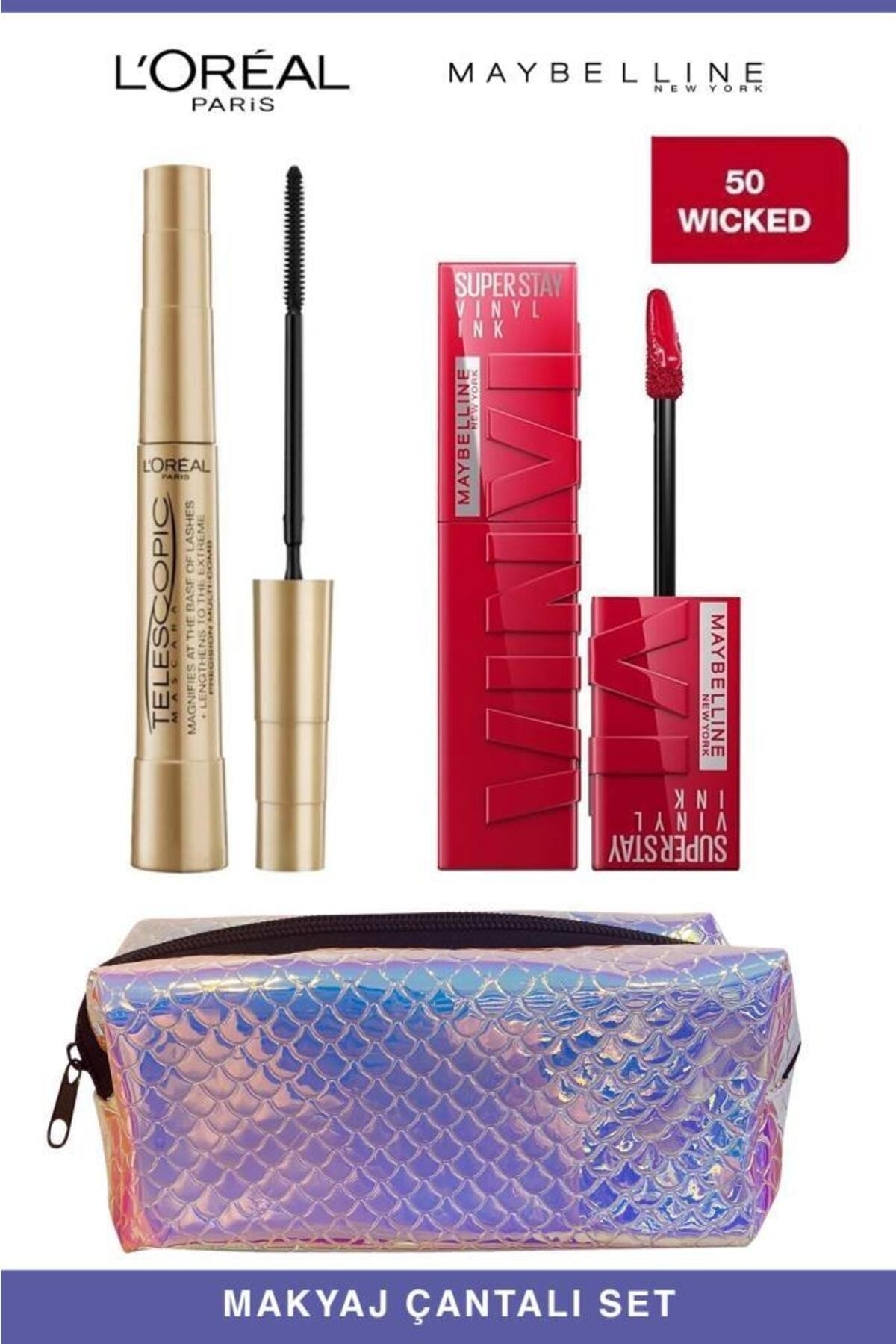 L'Oreal Paris Telescopic Instant Long Lashes-Maybelline Permanent and Full Lips 50 Wicked Makeup Set