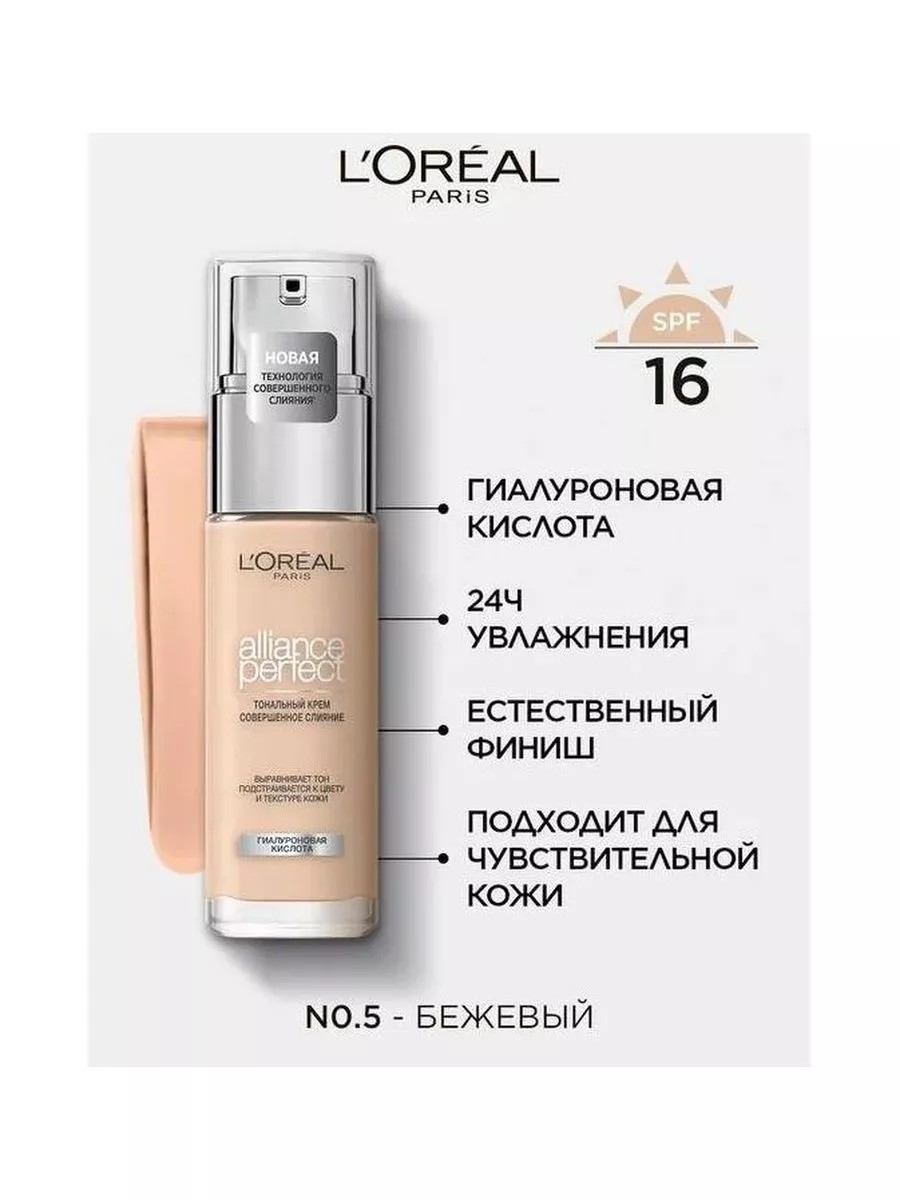 Alliance Perfect liquid foundation, enriched with hyaluronic acid, blends perfectly with your skin tone and visibly improves the condition of your skin. Benefits: - Evens out tone, adapts to the color and texture of the skin - Visibly transforms the skin in 2 weeks of use: the skin is smoother and more radiant - The formula is 80% moisturizing cream with hyaluronic acid - 24 hours of hydration for your skin - A natural finish with a subtle radiance effect - SPF 16 How to choose a shade: The number indicates the intensity of the tone: from the lightest 0.5 to the darkest 4. The letter indicates the undertone: N - for a neutral undertone, R / C - for a cool pink undertone, D / W for a warm golden undertone.