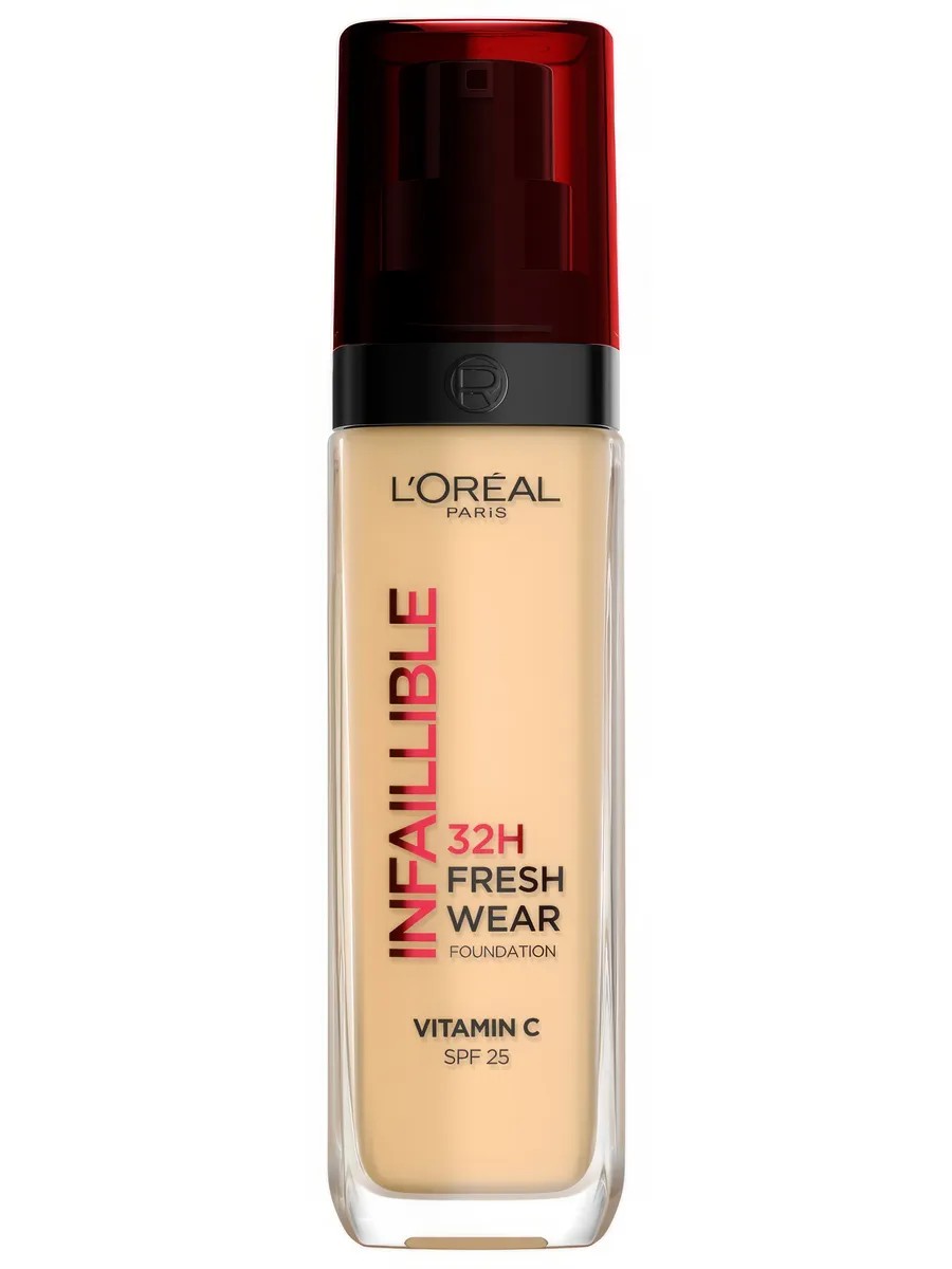 L'Oréal Paris Infaillible 32H Fresh Wear Foundation, SPF 25, Shade 120, 30 ml. The new-generation INFAILLIBLE 32H FRESH WEAR foundation provides a lightweight, long-lasting finish with UV protection. Allows skin to breathe, maintaining a long-lasting finish all day long. The formula contains caring ingredients: vitamin E and pearlescent pigment. More staying power, more care. Be INFAILLIBLE. Because you deserve it! How to use: Shake before use. Apply with your fingertips, spreading lightly over the entire face. For denser coverage, apply the cream with a brush. For lighter coverage, apply the foundation with a damp sponge. To set your makeup, we recommend using INFAILLIBLE mattifying powder. To correct skin imperfections, use the long-lasting, multi-functional INFAILLIBLE concealer. Composition: AQUA/WATER, DIMETHICONE, ISODODECANE, ALCOHOL DENAT., ETHYLHEXYL METHOXYCINNAMATE, TRIMETHYLSILOXYSILICATE, BUTYLENE GLYCOL, TITANIUM DIOXIDE [NANO]/TITANIUM DIOXIDE, PEG-10 DIMETHICONE, PERLITE, SYNTHETIC FLUORPHLOGOPITE, NYLON-12, ISOPROPYL LAUROYL SARCOSINATE, DIISOPROPYL SEBACATE, HDI/TRIMETHYLOL HEXYLLACTONE CROSSPOLYMER, DISTEARDIMONIUM HECTORITE, BIS-PEG/PPG-14/14 DIMETHICONE, MAGNESIUM SULFATE, ALUMINUM HYDROXIDE, PHENOXYETHANOL, DISODIUM STEAROYL GLUTAMATE, HYDROGEN DIMETHICONE, CELLULOSE, DIPENTAERYTHRITYL TETRAHYDROXYSTEARATE/TETRAISOSTEARATE, ASCORBYL GLUCOSIDE, SILICA SILYLATE, PARFUM/FRAGRANCE, CALCIUM ALUMINUM BOROSILICATE, TOCOPHEROL, SILICA, HEXYL CINNAMAL, BENZYL SALICYLATE, BHT, LINALOOL, ALPHA-ISOMETHYL IONONE, BENZYL ALCOHOL, CITRONELLOL, [+/- MAY CONTAIN CI 77891/TITANIUM DIOXIDE, CI 77491, CI 77492, CI 77499/IRON OXIDES, CI 77163/BISMUTH OXYCHLORIDE, MICA]