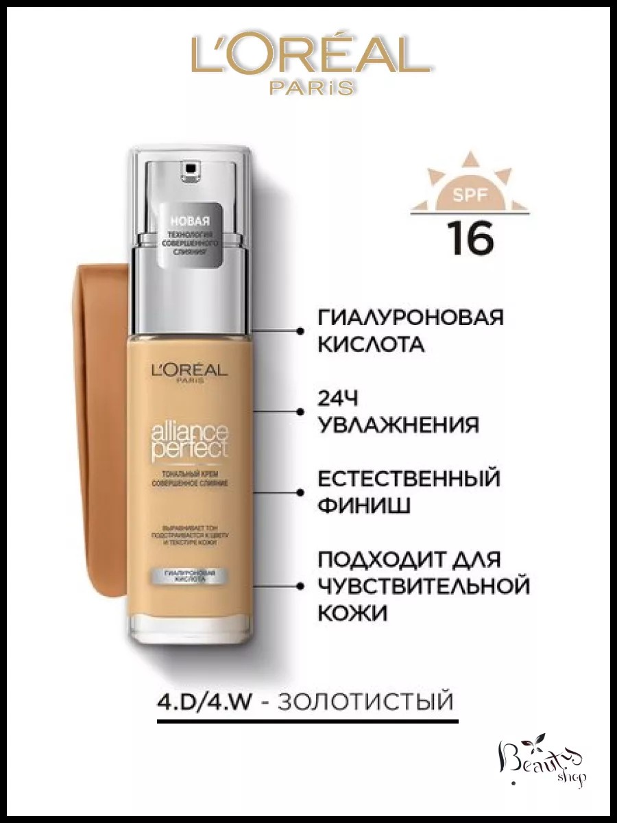 Жидкий тональный крем ALLIANCE PERFECT - АЛЬЯНС ПЕРФЕКТ от L'Oreal Paris (Лореаль Париж) выравнивает тон, подстраивается к цвету и текстуре кожи. Заметно преображает кожу за 2 недели применения: кожа более гладкая и сияющая. Ультра-тонкие пигменты подстраиваются под тон и подтон кожи. Формула на 80%, состоящая из увлажняющего крема с гиалуроновой кислотой. 24 часа увлажнения вашей кожи. Естественный финиш, сияющая кожа. SPF 16.