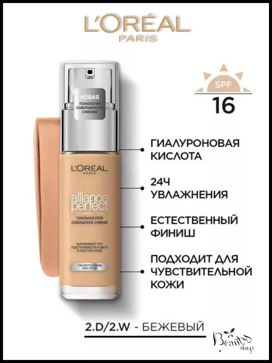 Жидкий тональный крем ALLIANCE PERFECT - АЛЬЯНС ПЕРФЕКТ от L'Oreal Paris (Лореаль Париж) выравнивает тон, подстраивается к цвету и текстуре кожи. Заметно преображает кожу за 2 недели применения: кожа более гладкая и сияющая. Ультра-тонкие пигменты подстраиваются под тон и подтон кожи. Формула на 80%, состоящая из увлажняющего крема с гиалуроновой кислотой. 24 часа увлажнения вашей кожи. Естественный финиш, сияющая кожа. SPF 16.