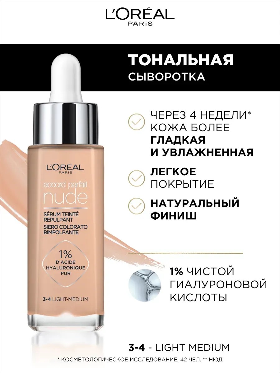 ALLIANCE PERFECT NUDE Hyaluronic Foundation Serum, 30 ml from L'Oreal Paris - the first hyaluronic foundation serum with 1% pure hyaluronic acid. New name: ACCORD PARFAIT NUDE. Alliance Perfect Nude Serum from L'Oreal Paris instantly evens skin tone like a foundation and improves skin elasticity like a serum. Light coverage and the radiance of healthy skin. The hyaluronic acid molecule fills wrinkles from within, and after just 6 weeks of use, the skin becomes smoother and more elastic, and wrinkles are visibly reduced. All the power of a hyaluronic acid serum is now in a foundation! Available in 4 shades with neutral undertones. Suitable for sensitive skin, non-comedogenic, and dermatologically tested. HOW TO USE: Shake well before use. Apply a few drops directly to the face. Spread evenly over the skin using your fingertips. Can be used alone or in combination with other makeup or skincare products.