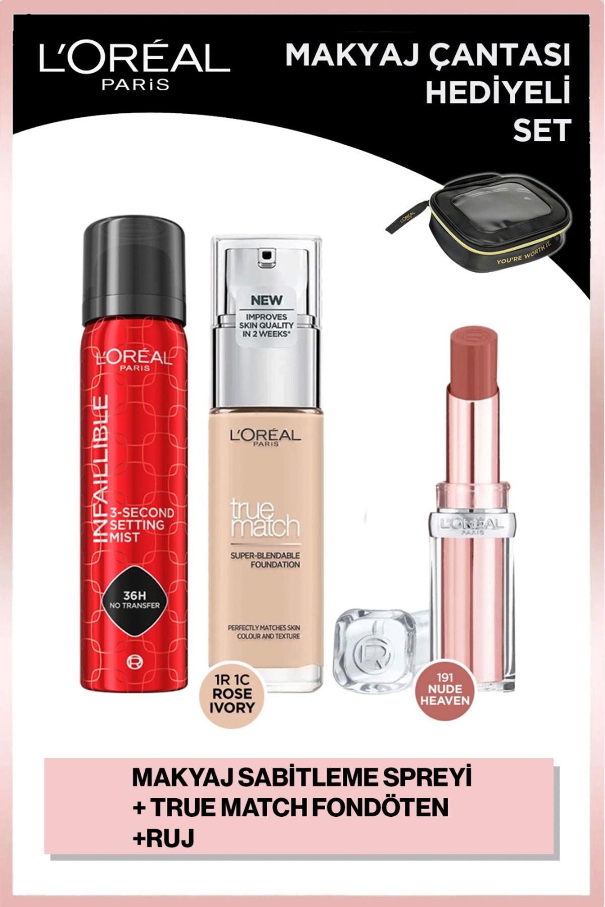 L'Oreal Paris True Match Foundation 1R Rose Ivory & Infaillable Make-up Setting Spray & Glow Paradise Balm Lipstick 191