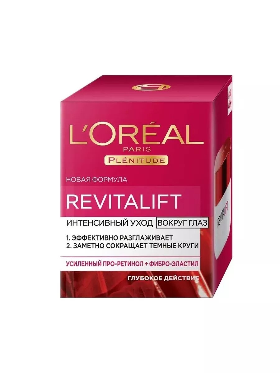 Revitalift Anti-Wrinkle Eye Cream 15 ml. Revitalift anti-aging face cream is a legendary treatment from L'Oréal Paris. It has a triple remodeling effect: it visibly reduces wrinkles, improves skin elasticity, and combats dark circles and bags under the eyes. The unique Stimulift technology included in the Revitalift formula is aimed at stimulating eight natural lifters in the skin's layers. It also contains Pro-Retinol A, which smooths wrinkles. As a result, skin appears more elastic and hydrated, wrinkles are reduced, and dark circles under the eyes disappear.