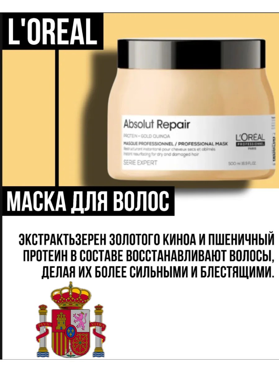 Частые проблемы в уходе за волосами - ломкость и отсутствие здорового блеска в результате различных повреждений: брашинг, выпрямление волос, окрашивание. Чтобы обеспечить волосам необходимое питание, используйте маску с кремовой текстурой Absolut Repair. Экстракт зерен золотого киноа и пшеничный протеин в составе восстанавливают волосы, делая их более сильными и блестящими. Маска идеально подходит для ухода как за натуральными, так и за окрашенными волосами. Теперь упаковка всех средств Serie Expert на 100% состоит из перерабатываемого пластика, за исключением крышки и этикетки. L’Oreal Professionnel уже 110 лет заботится о красоте женских волос: созданный в Париже, бренд является воплощением французской элегантности.