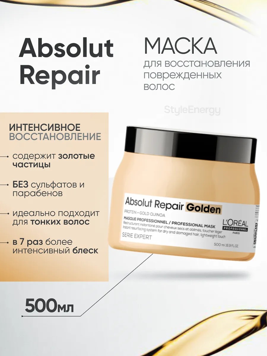 | Комплектация | Маска Absolut Repair Gold от L'Oreal Professionnel 500 мл; Маска с золотой текстурой Serie Expert Absolut Repair Masque gold, 500 мл -1шт |