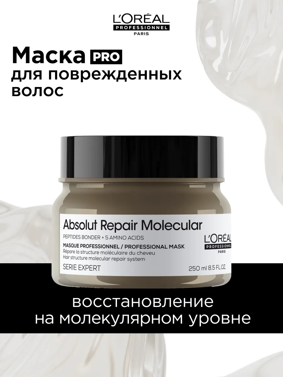 Профессиональная концентрированная маска Absolut Repair Molecular, обогащенная Пептидным бондером + 5 аминокислотами, для восстановления макро-молекулярной структуры волос.