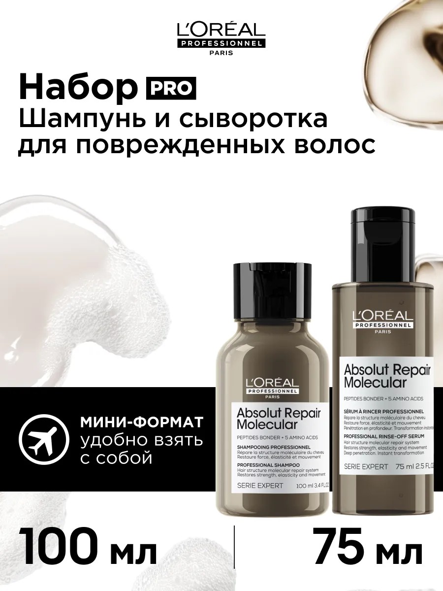 Вы отчаялись и думаете, что ваши локоны уже ничем не спасти? Инновационный профессиональный уход премиум-качества Absolut Repair Molecular способен восстановить структуру каждого волоса на макромолекулярном уровне даже после экстремальных повреждений!* Ранее процесс разрушения пептидной структуры волос считался необратимым. Однако впервые эксперты научного центра L’Oréal Advanced Research смогли разложить пептиды и по отдельности ввести в волокно их компоненты: пять аминокислот и 2%-й бондер. Попадая внутрь, они преобразуют и восстанавливают молекулярную структуру волос*, делая их вновь сильными, эластичными и блестящими! Чувство восторга дополняет тонкая композиция аромата из нот мускуса, белой лаванды, бергамота и не только! Удобный формат для путешествий, для того, чтобы взять в дорогу или в спортзал.