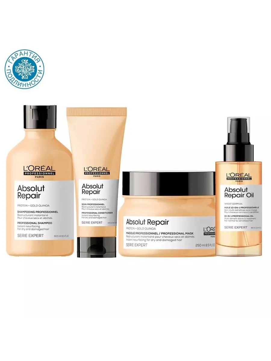 В состав набора входят 4 средства: 1.Шампунь Absolut Repair для восстановления поврежденных волос, 300 мл Мягко очищает поврежденные волосы, не пересушивая их в процессе мытья. Шампунь обладает роскошным чувственным ароматом. Укрепляет и защищает волосы от дальнейших повреждений. 2.Кондиционер Absolut Repair для восстановления поврежденных волос, 200 мл Мгновенно преображает поврежденные волосы, обеспечивает интенсивное восстановление без эффекта утяжеления. Волосы становятся более сильными и мягкими. Экстракт зерен золотого киноа и пшеничный протеин обеспечивают интенсивное восстановление, укрепляют и защищают структуру волоса. 3.Маска Absolut Repair для восстановления поврежденных волос, 250 мл Профессиональная формула, усиленная экстрактом зерен золотого киноа и пшеничным протеином, мгновенно восстанавливает структуру поврежденных волос, делая их более сильными, мягкими и блестящими. Обеспечивает волосам необходимое питание. 4.Масло 10 в 1 Absolut Repair Gold для восстановления поврежденных волос, 90 мл Гарантирует 10 мгновенных эффектов всего за 1 применение: питание, восстановление кортекса волоса, никакого утяжеления, мягкость, облегчение расчесывания, дисциплина, облегчение укладки, блеск, термозащита, гладкость. Для женщин Теперь упаковка всех средств Serie Expert на 100% состоит из перерабатываемого пластика, за исключением крышки и этикетки. L’Oreal Professionnel уже 110 лет заботится о красоте женских волос: созданный в Париже, бренд является воплощением французской элегантности. Набор может не иметь внешней упаковки, товары в набор вкладываются по отдельности.