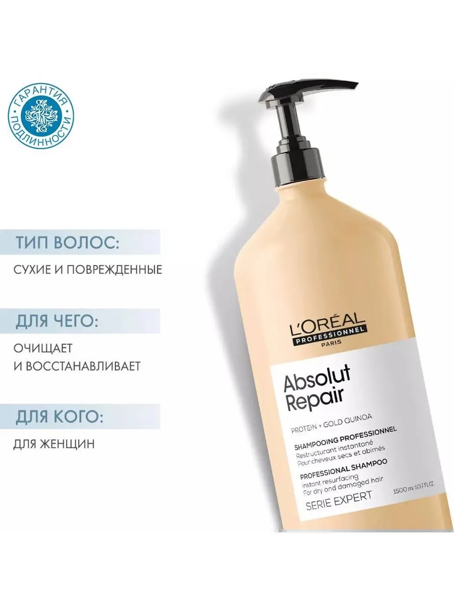 Абсолютный бестселлер в уходе за поврежденными волосами - шампунь Absolut Repair. Он мягко очищает поврежденные волосы, не пересушивая их в процессе мытья.Шампунь абсолютно не утяжеляет волосы, делает их более эластичными, придает блеск и обладает роскошным чувственным ароматом. Экстракт зерен золотого киноа и пшеничный протеин обеспечивают интенсивное восстановление, укрепляют и защищают волос от дальнейших повреждений. Теперь упаковка всех средств Serie Expert на 100% состоит из перерабатываемого пластика, за исключением крышки и этикетки. Упаовка для объема 1500 мл идет без дозатора-помпы.L’Oreal Professionnel уже 110 лет заботится о красоте женских волос: созданный в Париже, бренд является воплощением французскойэлегантности. *Обращаем Ваше внимание на то, что дозатор не входит в комплект