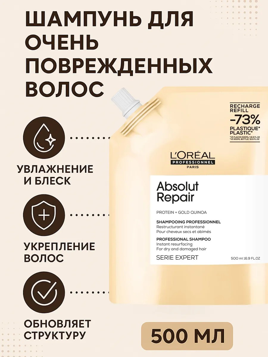 Restore your hair's former shine and health with Absolut Repair professional shampoo from L'Oréal Professionnel! This unique shampoo, specially designed to restore damaged hair, will become your faithful assistant in the fight for perfect hair. The Absolut Repair formula gently cleanses hair, removing dirt and styling residue, while carefully caring for each strand. The shampoo deeply nourishes and strengthens hair from the inside, restoring its strength and elasticity. After just one use, you will notice how your hair has become smoother, shinier, and more manageable. Absolut Repair is more than just cleansing; it is a true restorative ritual that will give your hair a second life! With this shampoo, you can enjoy healthy, strong, and shiny hair every day. Professional Absolut Repair shampoo for damaged hair, 500 ml. The shampoo gently cleanses damaged hair without drying it out. This restorative formula doesn't weigh hair down, makes it more elastic, adds shine, and has a luxurious scent. Active ingredients: Golden quinoa extract and wheat protein provide intensive repair, strengthening, and protection. Shampoo twice: once to cleanse. A second time to allow the active ingredients to work. This restorative shampoo for severely damaged hair contains golden quinoa extract and wheat protein to nourish, strengthen, and deeply repair hair. Its lightweight formula gently cleanses hair of impurities and instantly transforms it: curls look stronger, softer, and lighter from the roots, acquiring a radiant shine. The new Absolut Repair line restores damaged hair and gives it 7 times more shine.