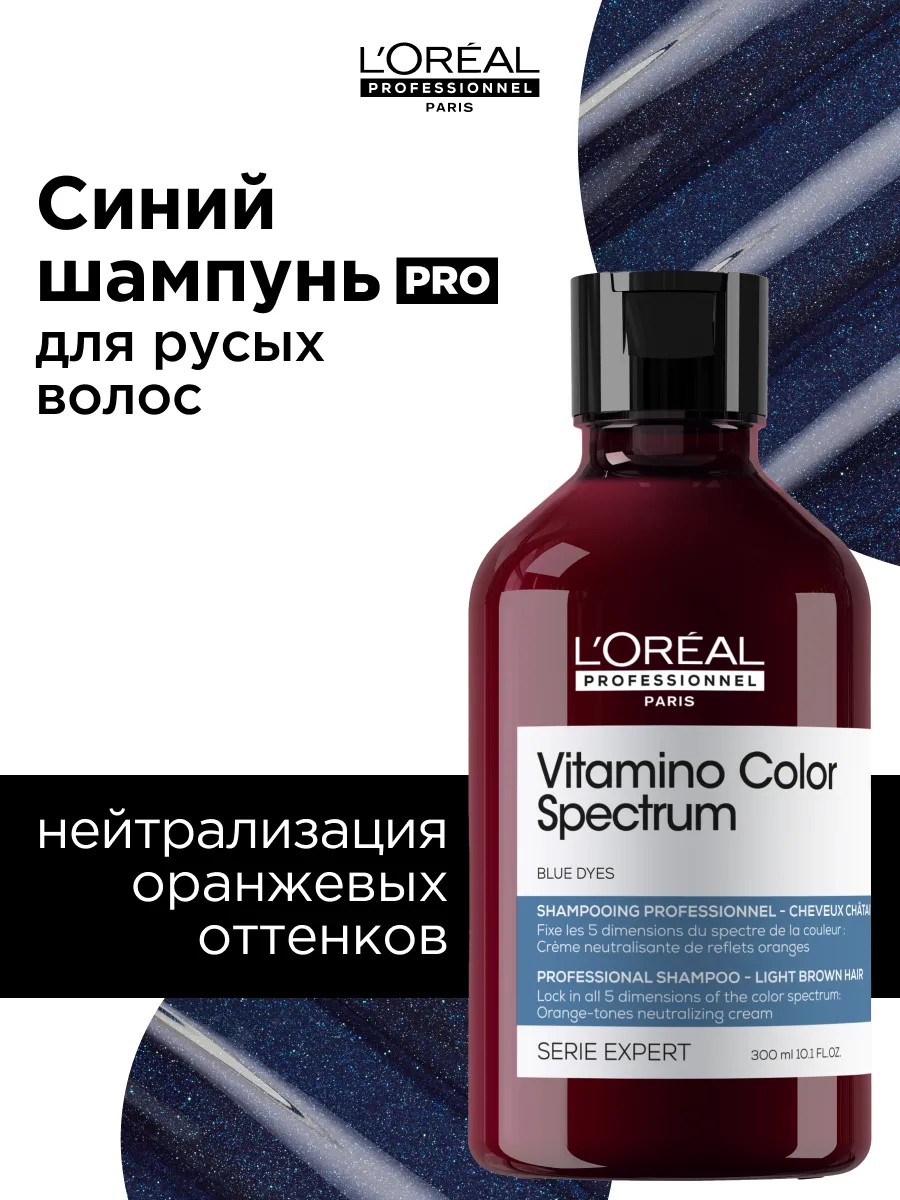 "Синий нейтрализующий шампунь Vitamino Color Spectrum позволит забыть о нежелательных оттенках и получить сияющий и чистый цвет ваших волос. Откройте секрет идеального тона и стойкости цвета с ультраухаживающим нейтрализующим шампунем Vitamino Color Spectrum. Разработанный специально для борьбы с нежелательными оттенками, этот шампунь содержит профессионально подобранные пигменты, которые мгновенно нейтрализуют оранжевый оттенок и поддерживают яркость цвета до 100 дней*. Роскошный тонированный очищающий крем при контакте с водой превращается в густую пену, которая легко наносится, распределяется и смывается. Аромат с неповторимой фруктовой композицией, навеянный изысканными парфюмами, остается на волосах приятным шлейфом. Почувствуйте силу профессионального** салонного ухода Vitamino Color Spectrum и наслаждайтесь безупречным тоном и сияющим блеском ваших волос. Рекомендуем использовать перчатки при нанесении. *Инструментальный тест **Для салонов красоты и домашнего использования.
