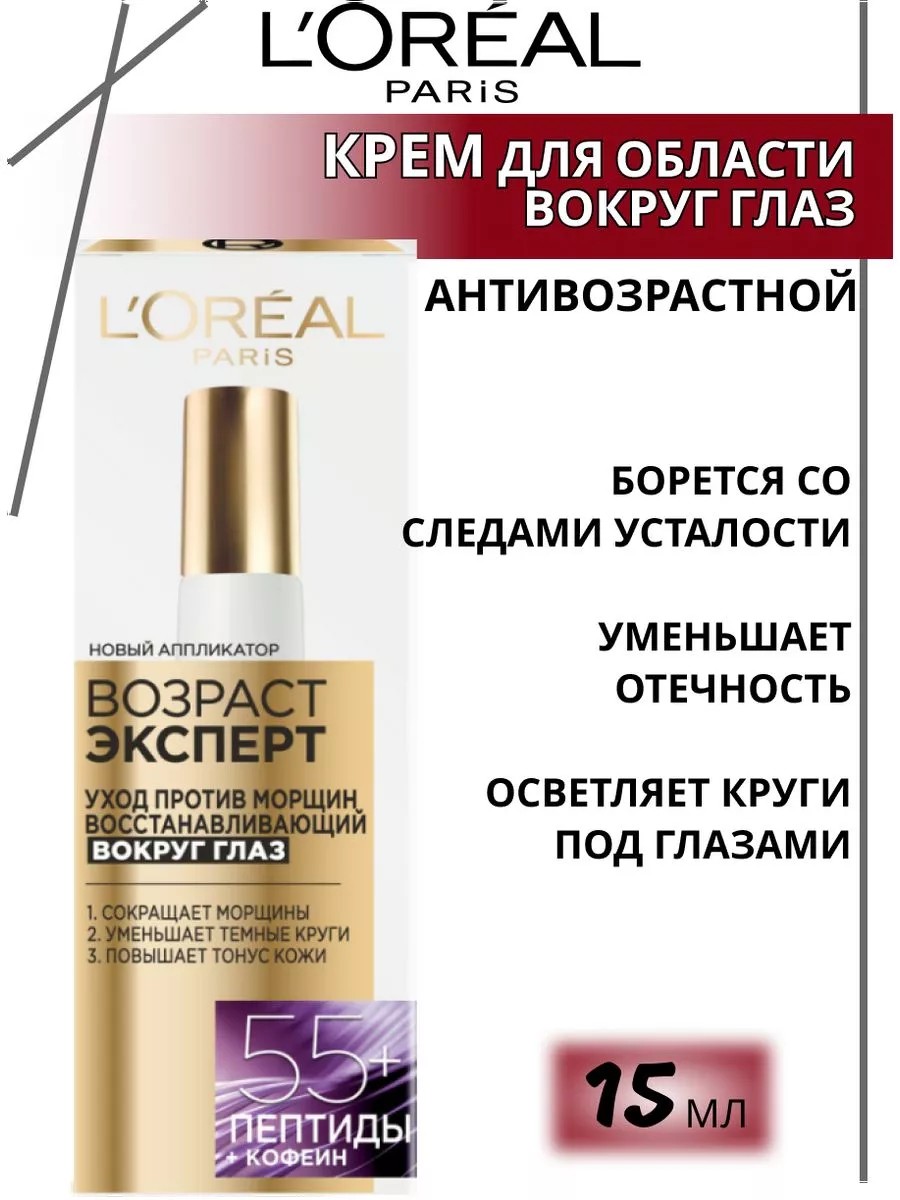 Крем для области вокруг глаз Возраст Эксперт 55+, против морщин, восстанавливающий. Восстанавливающий уход против морщин вокруг глаз Возраст Эксперт 55+. Борется со следами усталости, уменьшает отечность, осветляет круги под глазами. Благодаря активному компоненту аденозину морщины сокращаются и становятся менее заметными. Восстанавливающий уход вокруг глаз Возраст Эксперт 55+ от L'Oréal Paris создан специально для ухода за кожей после 55 лет. — пептиды стимулируют выработку эластина, способствуя восстановлению упругости и укреплению кожи. — кофеин пробуждает кожу, способствуя уменьшению темных кругов и мешков под глазами. увлажняющий и восстанавливающий уход для области вокруг глаз.Содержит масло ши, которое интенсивно увлажняет и питает кожу, а также экстракт ромашки, который успокаивает и освежает кожу, борется со следами усталости и темными кругами под глазами.Подходит для всех типов кожи, особенно для сухой и обезвоженной. Идеален, как основа под макияж! Эффект: сокращает морщины, восстанавливает упругость кожи и подтягивает контуры лица. Подтягивающий крем для кожи лица, шеи и зоны декольте выравнивает рельеф кожи, успокаивает, увлажняет и смягчает ее. Идеальная основа под макияж. anti age анти эйдж для всех типов кожи — в том числе для возрастной и чувствительной. Он стимулирует выработку собственного коллагена. Продукт содержит комплекс пептидов и аминокислот, поэтому оказывает комплексный уход за кожей всех типов днем и вечером. Восстанавливает до нормы липидный барьер на поверхности кожного покрова. Крем обеспечивает мощный лифтинг, эффективно борется с признаками старения. Омолаживающий крем сохраняет упругость и эластичность кожи женщины, разглаивает даже глубокие мимические морины. Профессиональная Косметика Лореаль Париж - отличный подарок для девушки. Качественная уходвая косметика - залог красоты и здоровья кожи в борьбе с несовершенствами. Рекомендуется использовать вместе с сывороткой и филлером этой же серии Лореаль.