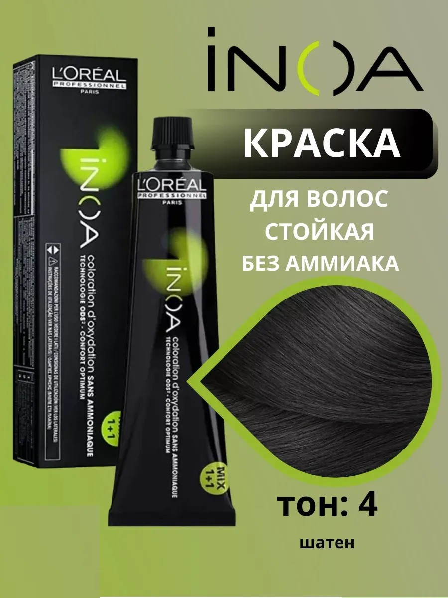 Loreal Professionnel Краска стойкая для волос Inoa ODS2 тон 4 (шатен), 60 мл - инновационное средство для бережного окрашивания волос любого типа. В процессе производства косметического продукта применяется уникальная технология Oil Delivery System, благодаря которой проникновение красящих веществ в структуру волос происходит с помощью минерального масла. Подходит для ранее окрашенных, натуральных волос. В составе краски отсутствует вредный аммиак, что гарантирует бережное окрашивание прядей и 100% защиту от негативного воздействия процедуры на состояние волос. Научно доказано, средство позволяет восполнить недостаток важных аминокислот в натуральных прядях и поддерживает на оптимальном уровне запас липидов. Состав краски Иноа подобран таким образом, что основной краситель отлично сочетается с олео-гелем и окислителем. Компоненты краски проникают в каждый волос, усиливая тем самым защиту от отрицательного воздействия внешних факторов. После окрашивания даже истонченные волосы становятся более плотными, приобретают шелковистость и блеск. Стойкость цвета и улучшение состояния прядей связано с наличием в составе краски минерального масла, которое в комбинации со щелочным компонентом и моноэтаноламином способствует усилению положительных свойств окрашивания. Роль окисляющих средств играют аскорбиновая и лимонная кислоты. Необходимая консистенция краски достигается благодаря наличию в составе глицерина. косметический продукт Иноа превращает обычное окрашивание в процедуру по уходу за волосами, которые обогащаются увлажняющими и питательными компонентами. Краска на 100% помогает избавиться от седины. Окрашивание происходит тон в тон либо можно выполнить осветление максимум на 3 тона. Косметическое средство легко смешивается с оксидантом, равномерно наносится на волосы и не вызывает раздражение кожи головы. После окрашивания волосы приобретают яркий цвет, становятся блестящими, шелковистыми и мягкими.