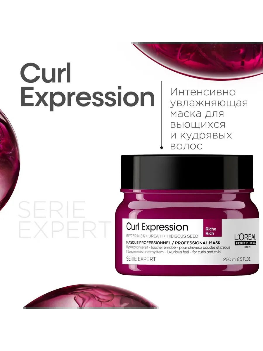 Professional intensely moisturizing Curl Expression mask for all types of curly hair. The formula is enriched with 3% glycerin, Urea H and hibiscus seed extract. Moisturizes and helps facilitate combing.