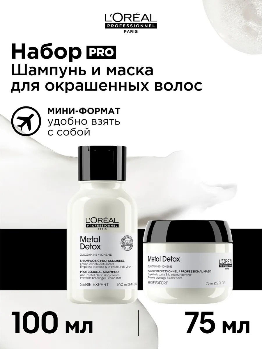 Sometimes even salon coloring doesn't guarantee the exact color you want. Why? Metallic copper particles accumulate in the hair cortex, distorting the shade. The solution is Metal Detox, an innovative, premium-quality professional treatment developed in collaboration with the world's best stylists and scientists! This range is designed to neutralize metal particles that enter the hair structure along with water. These particles not only distort the shade but also cause overall breakage! The patented glycoamine molecule in the Metal Detox shampoo and nourishing mask neutralizes the effects of metal and cares for the hair's quality, maintaining the results of salon coloring, balayage, or lightening. As a result, the color stays richer longer, and the hair is soft, strengthened, and shiny!* A mini hair care set consisting of shampoo and hair mask. Conveniently designed for travel, on the go, or at the gym. The perfect gift for March 8th or a birthday—for your mom, wife, friend, colleagues, and, of course, yourself! *Instrumental test. Apply shampoo to damp hair, lather, and rinse thoroughly. Apply the rinse-out mask to towel-dried hair. Rinse thoroughly. If it gets into your eyes, rinse immediately with water. Warm 1-2 pumps of oil in your palms and distribute evenly through the lengths and ends. Do not rinse. Proceed with styling or let your hair dry naturally. For daily use on dry or towel-dried hair.
