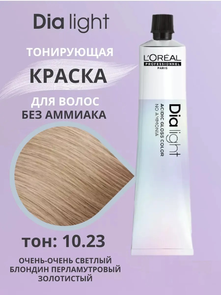 Loreal Dia Light Ammonia-Free Toning Hair Color, Shade: 10.23 (Very Light Blonde Pearlescent Golden), 50 ml. This tone-on-tone dye is based on an acidic pH and is specifically designed for colored and sensitive hair. Fragrance-free. The acidic pH of the ammonia-free formula prevents lightening, so it tones perfectly. The Dia Light formula, thanks to a specially selected polymer, adapts to the sensitivity of the hair fiber: the more sensitive and lightened the hair, the better the coloring agents appear in these areas, allowing for optimal color uniformity along the entire length of the hair without causing color overload. This next-generation dye gently cares for hair. It is ideal for women with damaged and sensitive hair after numerous colorings, highlights, perms, or straightening. Ammonia-free L'oreal Professionnel Dia Light hair dye gives hair a more natural, vibrant shade. The hair structure is not damaged during the coloring process, leaving your locks healthy and shiny! Ideal for color-treated, bleached, or sensitive hair. Ideal for refreshing, enriching, and color correction. It adds a vinyl shine and radiance. Used in the DIA Lamination service. Does not lighten hair. Not intended for coloring gray hair.