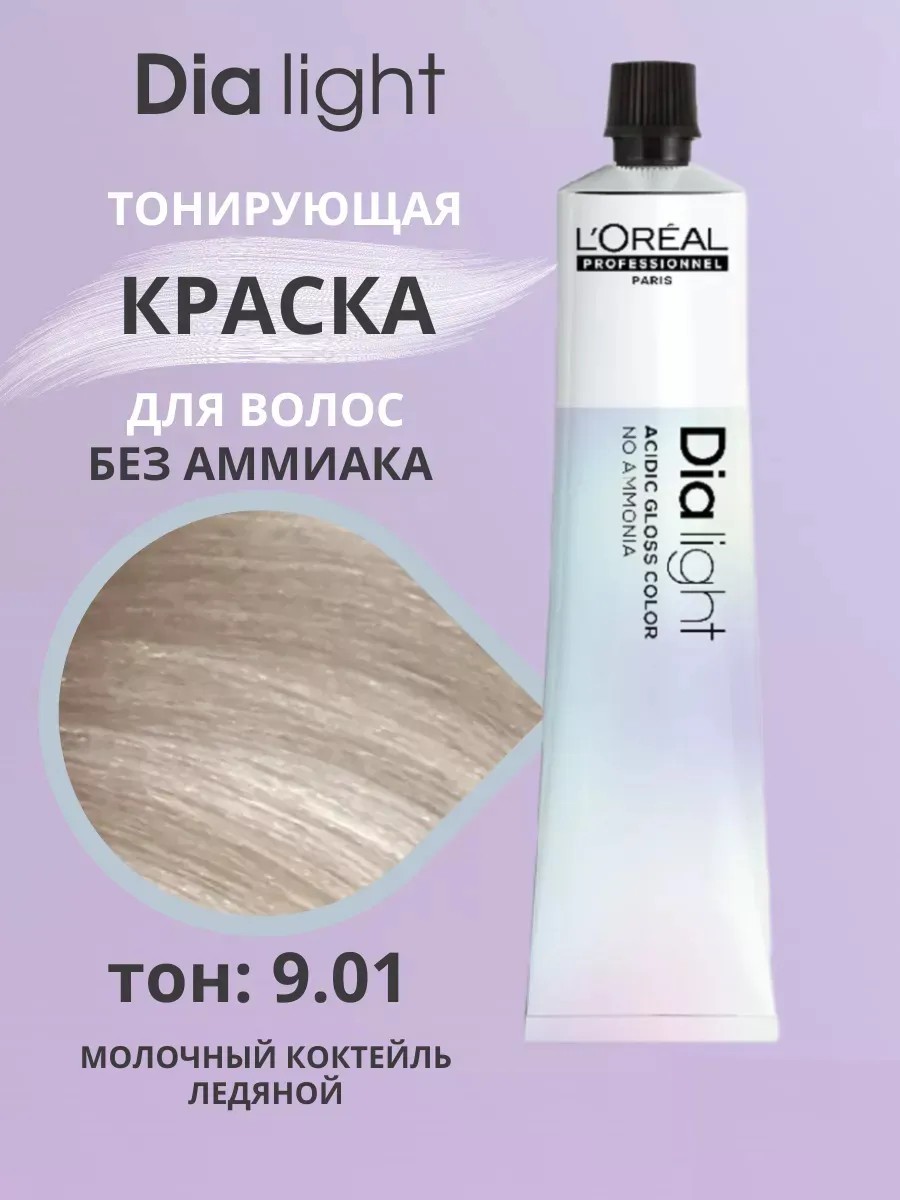 Loreal Dia Light Ammonia-Free Toning Hair Color, Shade: 9.01 (Ice Milkshake), 50 ml. This tone-on-tone dye is based on an acidic pH and is specifically designed for colored and sensitive hair. Fragrance-free. The acidic pH of the ammonia-free formula prevents bleaching, providing excellent toning. The Dia Light formula, thanks to a specially selected polymer, adapts to the sensitivity of the hair fiber: the more sensitive and bleached the hair, the better the coloring agents appear in these areas, allowing for optimal color uniformity along the entire length of the hair without causing color overload. This next-generation dye gently cares for hair. It is ideal for women with damaged and sensitive hair after numerous colorings, highlights, perms, or straightening. Ammonia-free L'oreal Professionnel Dia Light hair dye gives hair a more natural, vibrant shade. The hair structure is not damaged during the coloring process, leaving your locks healthy and shiny! Ideal for color-treated, bleached, or sensitive hair. Ideal for refreshing, enriching, and color correction. It adds a vinyl shine and radiance. Used in the DIA Lamination service. Does not lighten hair. Not intended for coloring gray hair.