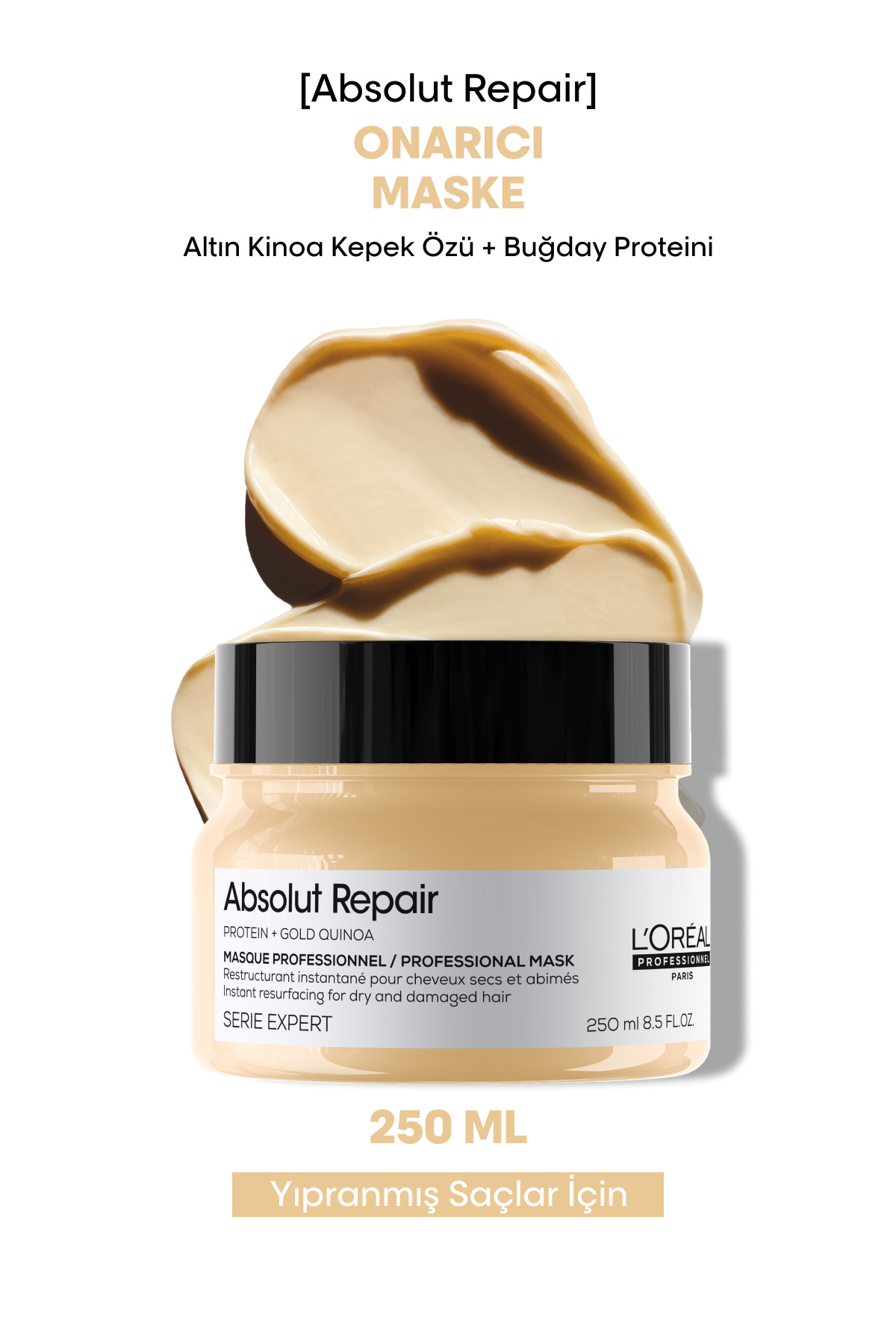 L'Oréal Professionnel Absolut Repair serisi asiri yipranmis saçlar için yogun cilt bakim tedavilerinden esinlenerek gelistirilen bir saç bakimi serisidir. Yogun kimyasal isleme maruz kalmis saçlarin hasar görüp bozulan yapisini iyilestirerek daha kolay sekil alan, parlak ve saglikli görünen saçlar ortaya çikarmayi hedefler. Absolut Repair maske, çok zarar görmüs ve zarar görmüs saçlar için aninda onarilabilen bir maskedir. Saçi yumusak, parlak ve kullanimi kolay, agirliksiz birakarak onarir Zayiflamis saç telini derinlemesine besler ve onarir, böylece saçlarinizin yenilenmesini, yumusaklasmasini ve parlaklasmasini saglar. Faydalari Yipranmis saçlari derinlemesine onarir. Saç aninda daha yumusak, güçlü ve isiltili görünür. Uygulama Absolut Repair sampuan ile saçinizi yikadiktan sonra havlu ile nemi alinmis saçinizin boy ve uçlarina uygulayiniz. 3-5 dakika arasi bekletiniz. Sonrasinda tamamen durulayiniz.