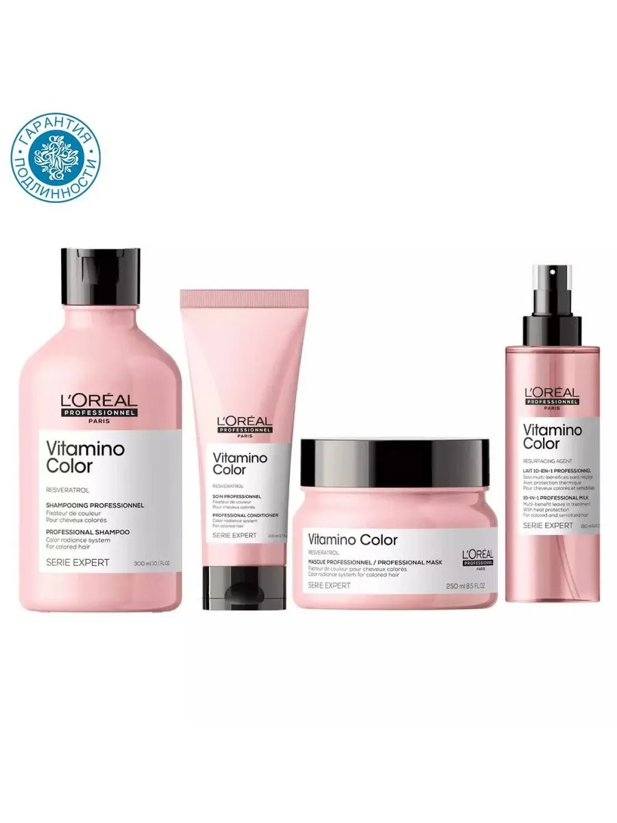 The set includes 4 products: Vitamino Color Shampoo for Colored Hair, 300 ml. Gently cleanses, leaving hair soft and shiny. Does not dry out or weigh down strands, protecting the hair fiber from external damage. The professional formula with resveratrol, a natural polyphenol obtained from grape skins, protects color-treated hair from fading for up to 8 weeks, as well as the hair fiber from external damage to preserve the results of salon coloring. Vitamino Color Conditioner for Colored Hair, 200 ml. Helps prolong the effect of salon coloring. Gives color-treated hair luxurious shine and softness, making combing easier and preventing tangling. Its light texture does not weigh hair down, and the special formula maintains color saturation. Result: Protects the hair fiber and maintains color saturation. Long-lasting color for up to 8 weeks after coloring. Detangles. Hair is soft, shiny, and radiant right to the ends. Vitamino Color Mask for Colored Hair, 250 ml. An absolute bestseller in color-treated hair care. The professional formula with resveratrol, a natural polyphenol derived from grape skins, protects color-treated hair from fading for up to 8 weeks, as well as the hair fiber from external damage. Nourishes hair, making it stronger and softer in just 1 minute. Vitamino Color Heat Protectant Spray for Colored Hair, 190 ml. Contains antioxidants that provide unrivaled protection for color-treated hair. This multi-functional spray can be used before cutting, before styling, or as a finishing spray. Helps prolong the effect of salon coloring. All Serie Expert products are now packaged with 100% recyclable plastic, with the exception of the cap and label. L'Oreal Professionnel has been caring for the beauty of women's hair for 110 years: founded in Paris, the brand is the embodiment of French elegance. The set has no outer packaging; the products are inserted individually.