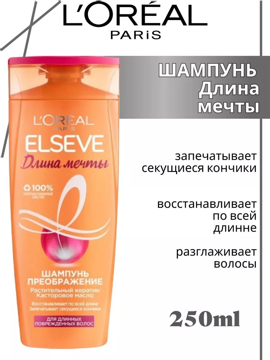 Преображающий шампунь Elseve Длина Мечты для длинных поврежденных волос. Уникальная формула шампуня обогащена питательным коктейлем, который запечатывает секущиеся кончики и восстанавливает волосы по всей длине: — растительный кератин восстанавливает ваши волосы до самых кончиков — витамин В5 укрепляет волосы — касторовое масло глубоко питает, дарит блеск и здоровому виду длинных волос. Шампунь Elseve Длина мечты бережно очищает волосы. После его применения они становятся послушными, мягкими, не путаются, поэтому легко расчесываются и меньше травмируются. Подходят для ухода за непослушными и пушистыми волосами, ослабленными после химических воздействий – окрашивания, осветления, химической завивки. Шампунь подходит для ежедневного домашнего и салонного ухода за окрашенными, осветленными до блонда волосами. обогащенный жидким протеином, очищает и удаляет остатки средств для укладки, укрепляет, подготавливает волокно волоса и разглаживает кутикулу. АКТИВНЫЕ ИНГРЕДИЕНТЫ: Гидролизованный пшеничный протеин обеспечивает питание и реконструкцию волос, способствует сохранению эластичности, гладкости и яркости цвета. Гидролизованный протеин сои оказывает интенсивный питательный и защитный эффект. Глицерин защищает от сухости и обезвоженности, способствует разглаживанию, смягчению и легкому расчесыванию волос. Салициловая кислота обеспечивает глубокое очищающее действие, бережно удаляя с кожи головы ороговевшие клетки. После очищения шампунем используйте кондиционер и спрей против ломкости и пористости Лореаль . Профессиональный шампунь разработан для очищения, восстановления и укрепления очень сухих, ломких и поврежденных волос. Шампунь Эльсев подходит для ежедневного домашнего и салонного ухода за окрашенными, мелированными, обесцвеченными, осветленными до блонда волосами. Ухаживающая формула с протеиновым комплексом помогает восстановить силу, гладкость и мягкость волос от корней до самых кончиков, уменьшить их ломкость и пушистость.
