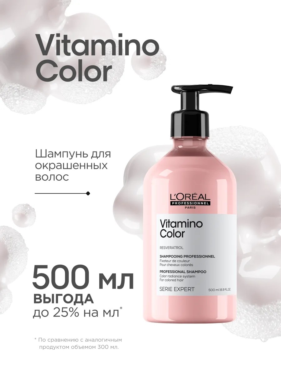 Способ применения: нанесите на влажные волосы, вспеньте и смойте. При попадании в глаза промойте их водой. Используйте совместно со смываемым уходом Витамино Колор.