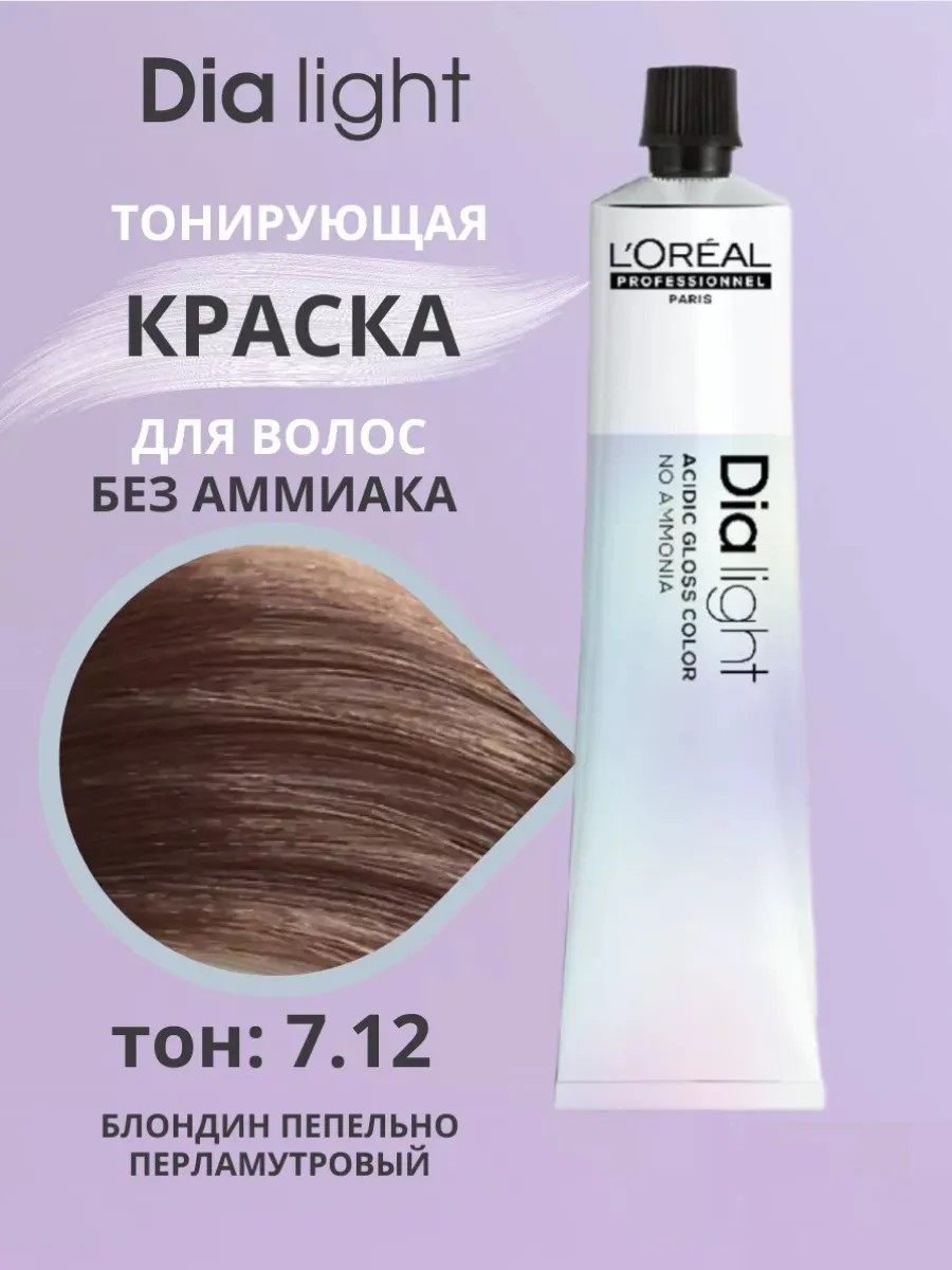Loreal Dia Light Ammonia-Free Toning Hair Color, Shade: 7.12 (Ash Pearl Blonde), 50 ml. This tone-on-tone dye is based on an acidic pH and is specifically designed for colored and sensitive hair. Fragrance-free. The acidic pH of the ammonia-free formula prevents bleaching, providing excellent toning. The Dia Light formula, thanks to a specially selected polymer, adapts to the sensitivity of the hair fiber: the more sensitive and bleached the hair, the better the coloring agents appear in these areas, allowing for optimal color uniformity along the entire length of the hair without causing color overload. This next-generation dye gently cares for hair. It is ideal for women with damaged and sensitive hair after numerous colorings, highlights, perms, or straightening. Ammonia-free L'oreal Professionnel Dia Light hair dye gives hair a more natural, vibrant shade. The hair structure is not damaged during the coloring process, leaving your locks healthy and shiny! Ideal for color-treated, bleached, or sensitive hair. Ideal for refreshing, enriching, and color correction. It adds a vinyl shine and radiance. Used in the DIA Lamination service. Does not lighten hair. Not intended for coloring gray hair.