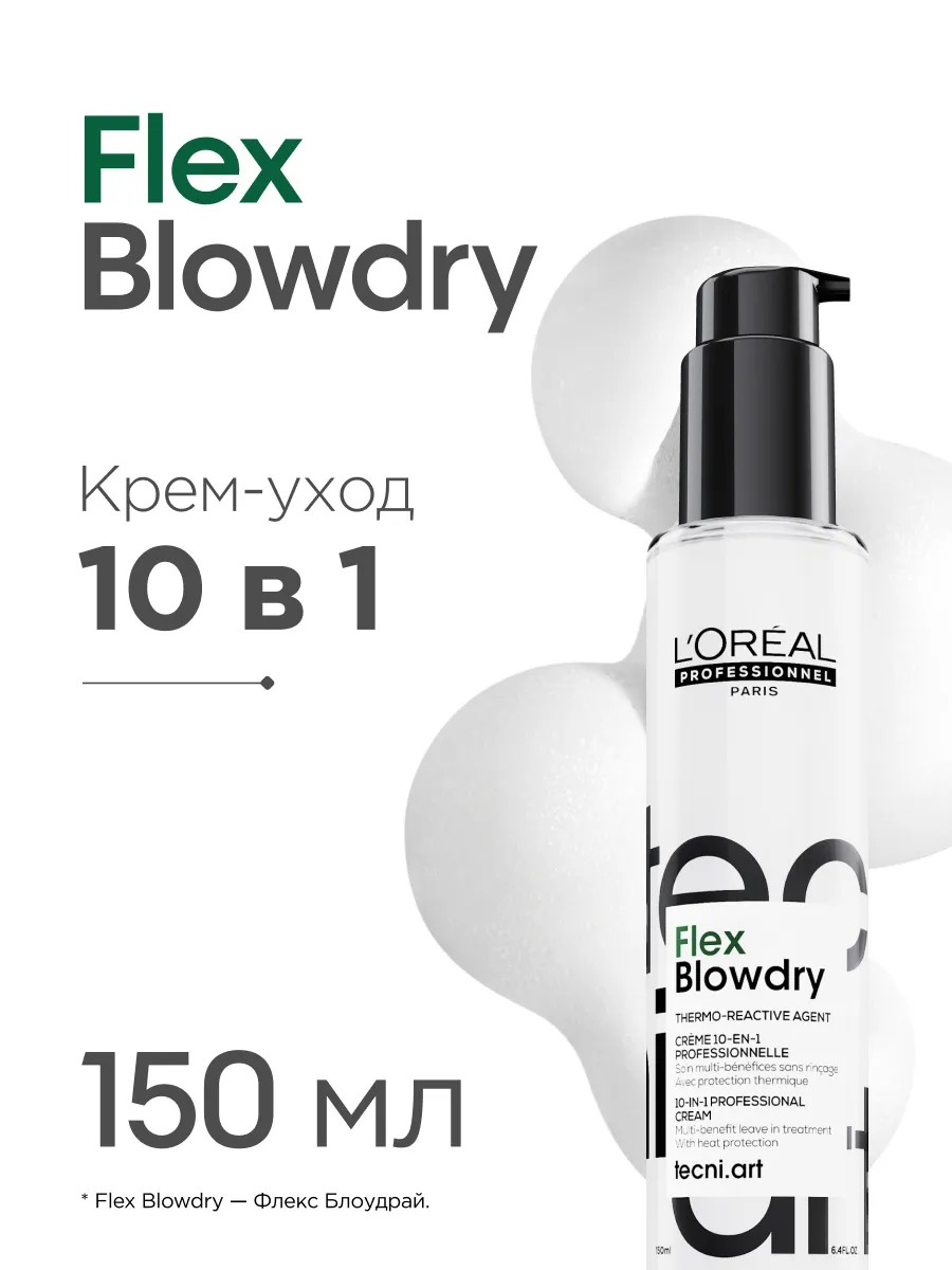 10-в-1 профессиональный многофункциональный несмываемый термозащитный крем-уход Flex Blowdry. Одно применение - 10 преимуществ: