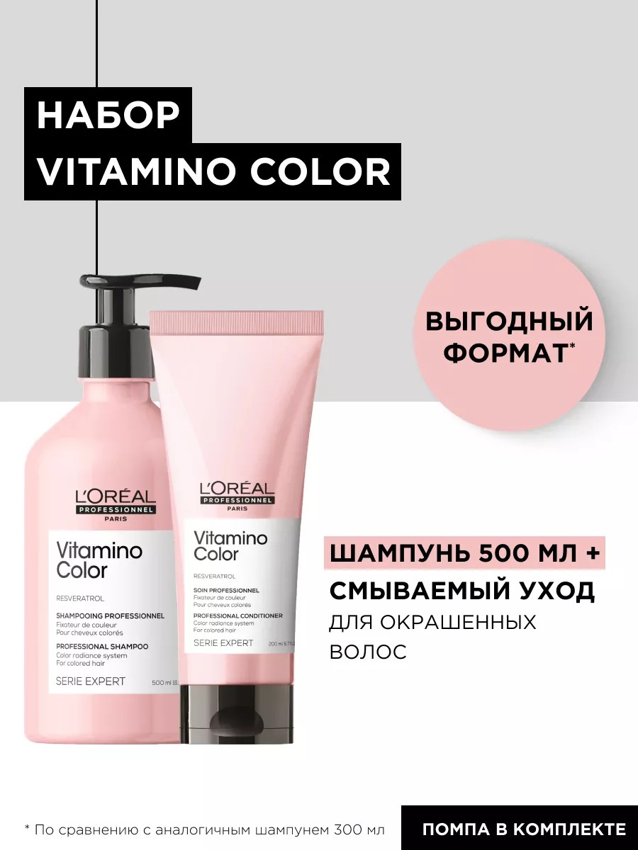 The set includes Vitamino Color professional shampoo for color-treated hair, 500 ml, and Vitamino Color professional hair conditioner, 200 ml.