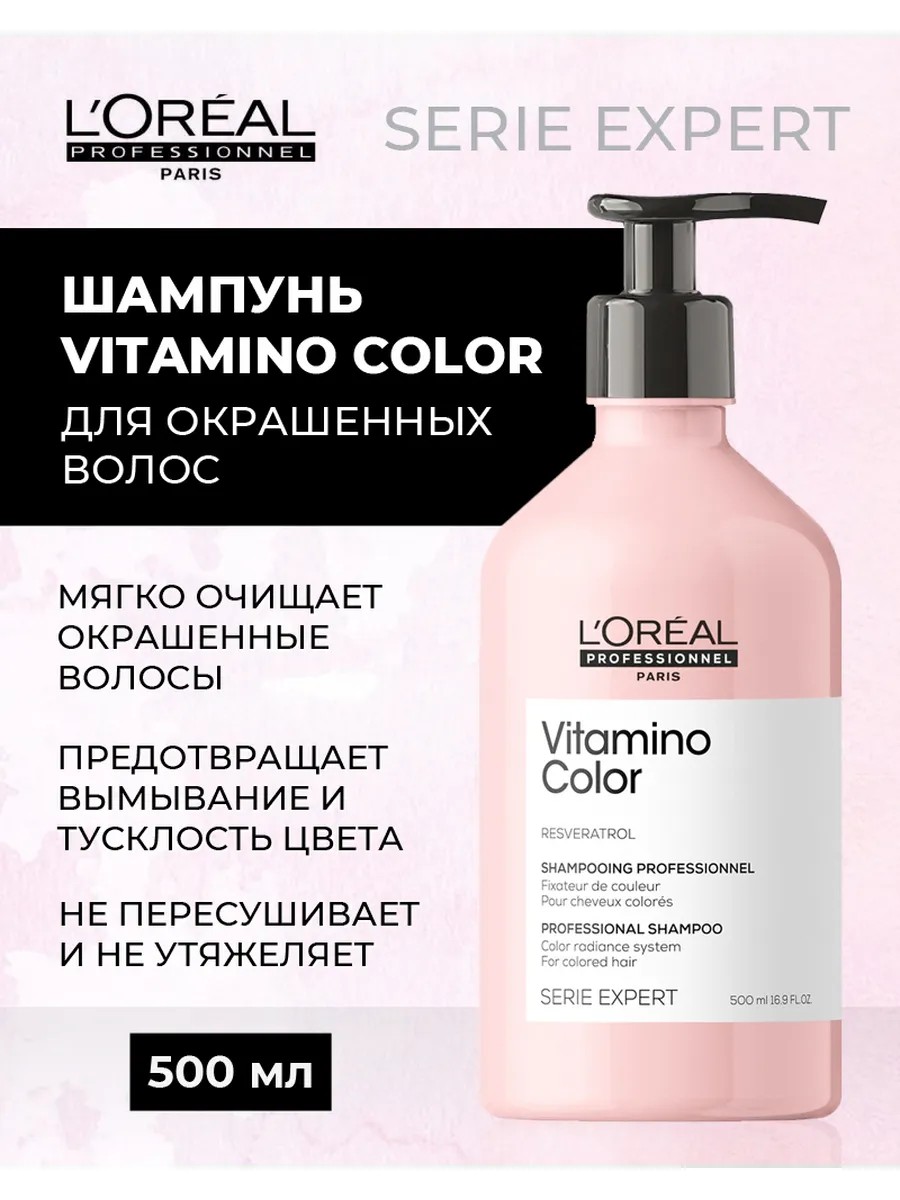 Профессиональный шампунь Vitamino Color (Витамино Колор) от L’Oreal Professionnel для окрашенных, осветленных и мелированных волос деликатно очищает волосы и поддерживает яркость цвета и блеск. Мягкая формула средства подходит даже для девушек с ослабленными волосами и может использоваться ежедневно. Шампунь защищает волокно волоса от внешних повреждений, не пересушивая и не утяжеляя их, благодаря активному компоненту Ресвератролу - натуральному антиоксиданту из ягод винограда, который: - укрепляет структуру волос и обеспечивает защиту пигмента от вымывания; - нейтрализует воздействие UV-лучей и препятствует выгоранию волос на солнце.