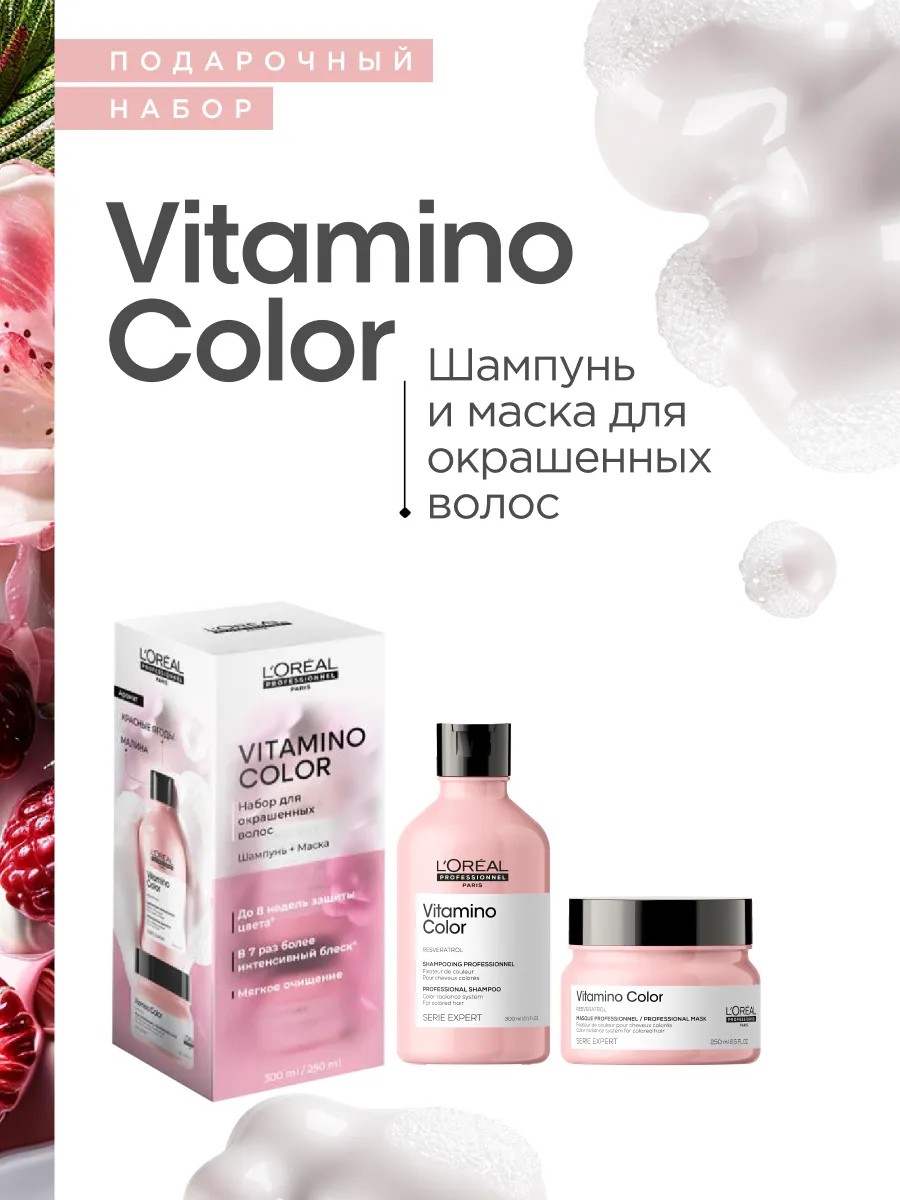 Как максимально продлить эффект салонного окрашивания? При помощи правильно подобранного профессионального ухода Vitamino Color! Главный компонент гаммы — ресвератрол, натуральный антиоксидант из ягод винограда. Он защищает волосы от свободных радикалов, которые делают пигмент тусклым. Результат — стойкий цвет до 8 недель* после окрашивания! Шампунь мягко очищает волосы и предотвращает вымывание цвета. Маска интенсивно питает, придает роскошный блеск и мягкость, не утяжеляя локоны. А сочный аромат малины и красных ягод подарит чудесное ощущение на весь день! С Vitamino Color вы забудете о пересушенных и спутанных после окрашивания прядях! Идеальный подарок на 8 Марта или день рождения — для мамы, жены, подруги, коллег и, конечно же, для себя! * Инструментальный тест.