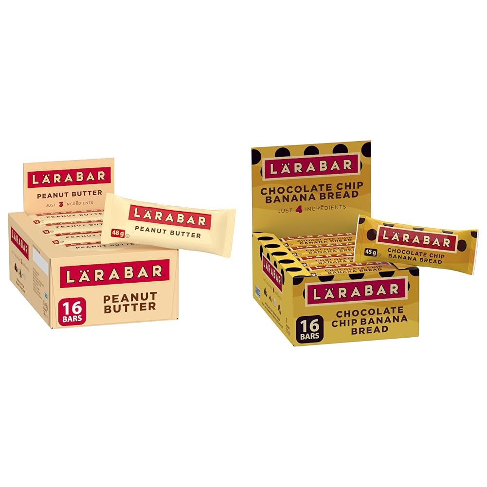 LÄRABAR Peanut Butter, Fruit and Nut Energy Bar, Pack of 16 Bars, Gluten Free, Vegan, Family Pack, Snack Bars This simple mix of 3 ingredients (peanuts, dates and sea salt) provides 7g of protein in the form of a moist and chewy treat. No wonder this is one of Lara's Favourites. We at LÄRABAR believe that a sound mind, body and spirit are derived from what you eat – and that food is most satisfying in its simplest form. A magical harmony of fruits and nuts, LÄRABAR contains only the best ingredients. Simple and delicious. Enjoy! LÄRABAR Chocolate Chip Banana Bread, Fruit and Nut Energy Bar, Pack of 16 Bars, Gluten Free, Vegan, Family Pack, Snack Bars, 720 Grams Package We at LÄRABAR™ believe that a sound mind, body and spirit are derived from what you eat – and that food is most satisfying in its simplest form. A magical harmony of fruits and nuts, LÄRABAR™ contains only the best ingredients. Simple and delicious. Enjoy!Product 2: KOSHER: kosher product. Product 2: SOURCE OF: Potassium and Iron. Product 2: FREE FROM: Gluten free and dairy free. Product 2: SIMPLE: Just 4 ingredients . Product 1: KOSHER: kosher product. Product 1: FIBRE: 4g of Fibre per 48g bar. Product 1: FREE FROM: Gluten free, dairy free, cholesterol free and soy free. Product 1: SIMPLE: Just 3 ingredients.