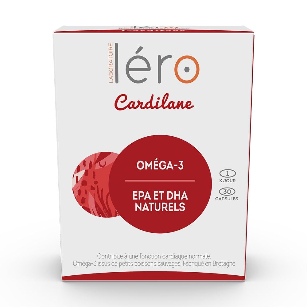 Each Léro Cardilane capsule contains 257 mg of EPA DHA, specific polyunsaturated fatty acids, contributing to normal cardiac function. The Lero Cardilane innovation: - The EFSA (European Food Safety Authority), the European authority certifying food supplements, recently recognized the role of polyunsaturated fatty acids, omega-3, in maintaining normal cardiac functioning on the condition of providing at least 250 mg of these fatty acids every day. - Léro Cardilane benefits from Biosol technological innovation. Biosol is a micro-emulsification process which broadens the absorption surface of EPA DHA fatty acids. This aims to facilitate their assimilation by the body. - Since Léro Cardilane has a high dose of fish oil, we have added lemon essential oil which helps prevent possible gastric reflux linked to this high dosage of fish oil. Made in France. INGREDIENTS Wild fish oil rich in EPA and DHA, Fish gelatin, Humectant: Glycerin, Antioxidant: Tocopherols, Rosemary extract (Rosmarinus officinalis). Analysis For 1 capsule Wild fish oil rich in 150 mg of EPA and 110 mg of natural DHA (omega-3) 500 mgFor the proper functioning of the cardiovascular system. Chaque capsule de Léro Cardilane contient 257 mg d'EPA DHA, acides gras poly-insaturés spécifiques, contribuant à une fonction cardiaque normale. L'innovation Lero Cardilane : - L'EFSA (European Food Safety Authority), autorité européenne certifiant les compléments alimentaires, a récemment reconnu le rôle des acides gras poly-insaturés, oméga-3, dans le maintien d'un fonctionnement cardiaque normal à la condition d'apporter chaque jour au moins 250 mg de ces acides gras. - Léro Cardilane bénéficie de l'innovation technologique Biosol. Biosol est un procédé de micro-émulsification qui permet d'élargir la surface d'absorption des acides gras EPA DHA. Ceci a pour but de faciliter leur assimilation par l'organisme. - Léro Cardilane étant fortement dosé en huile de poissons, nous y avons rajouté de l'huile essentielle de citron qui permet d'éviter un éventuel reflux gastrique lié à ce fort dosage en huile de poissons. Fabriqué en France. INGRÉDIENTS Huile de poissons sauvages riche en EPA et DHA, Gélatine de poissons, Humectant : Glycérine, Antioxydant : Tocophérols, Extrait de romarin (Rosmarinus officinalis). Analyse Pour 1 capsule Huile de poissons sauvages riche de 150 mg d'EPA et de 110 mg de DHA naturels (oméga-3) 500 mgPour le bon fonctionnement du système cardio-vasculaire.