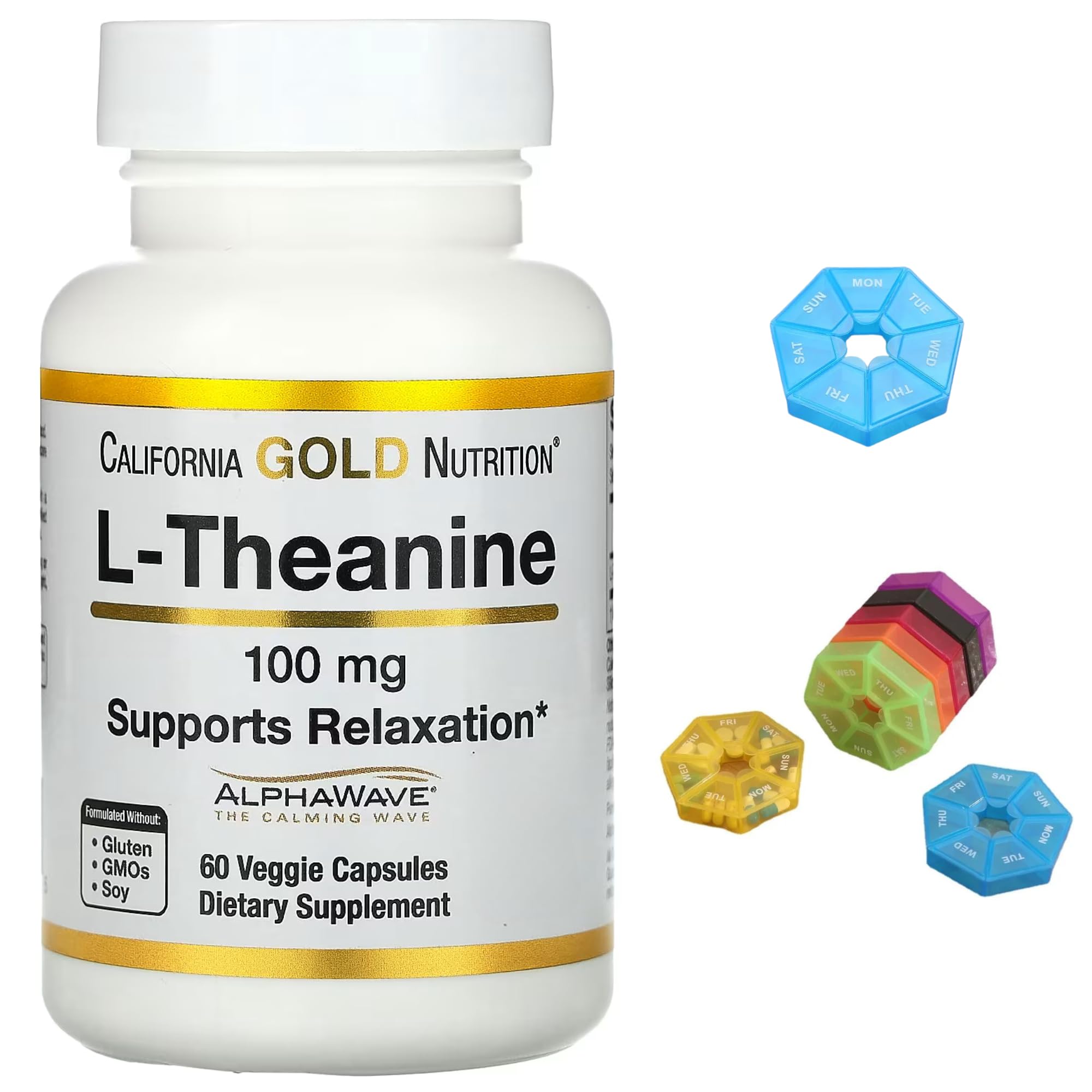 L-Theanine Compatible With California Gold Nutrition Featuring AlphaWave 100 mg 60 Capsules + Bonus Pill Organizer Weekly Pill Organizer Mini