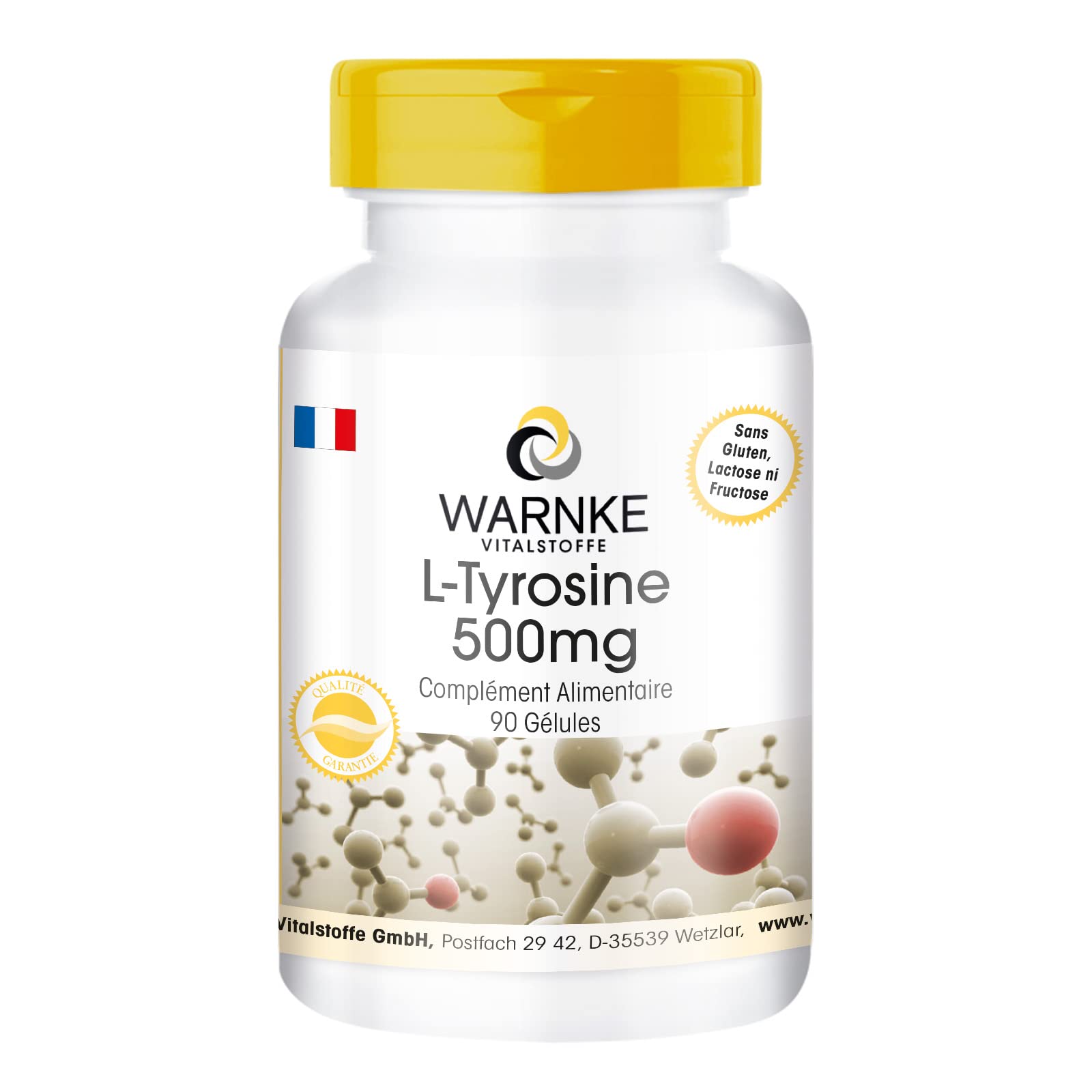 Quality and user-friendliness: Our products comply with HACCP quality standards. Made in Germany. Raw materials sourced from EU and non-EU countries. The optimized packaging with a sealed dosing cap ensures long-term shelf life and easy dosing of your dietary supplements. Contents: 90 capsules of L-Tyrosine 500 mg for 30 days. Economical packaging without magnesium stearate! Highly dosed. Dosage: Adults, 3 capsules daily with a large glass of water. Ingredients: L-Tyrosine, bulking agent microcrystalline cellulose, glazing agent hydroxypropylmethylcellulose (capsule shell), anti-caking agent magnesium salts of fatty acids, anti-caking agent calcium salts of orthophosphoric acid, anti-caking agent potato starch mixture. Excellent value for money - German quality - L-Tyrosine -.Qualité et convivialité : nos produits sont conformes aux normes de qualité HACCP. Fabriqués en Allemagne. Matières premières provenant de pays de l'UE et hors UE. L'emballage optimisé avec un couvercle doseur scellé assure la longue conservation de vos compléments alimentaires et leur dosage facile. Contenu : 90 gélules de L-Tyrosine 500 mg pour 30 jours. conditionnement économique sans stéarate de magnésium ! Hautement dosé. Posologie : adultes, 3 gélules par jour avec un grand verre d'eau. Ingrédients: L-Tyrosine, agent de charge cellulose microcristalline, agent d'enrobage hydroxypropylméthylcellulose (enveloppe de la gélule), antiagglomérant sels de magnésium d'acides gras alimentaires, agent antiagglomérant sels calciques de l'acide orhophosphoriquen agent atiagglomérant mélange d'amison de pomme de terre. Excellent rapport Qualité prix - Qualité allemande - L-Tyrosine -.
